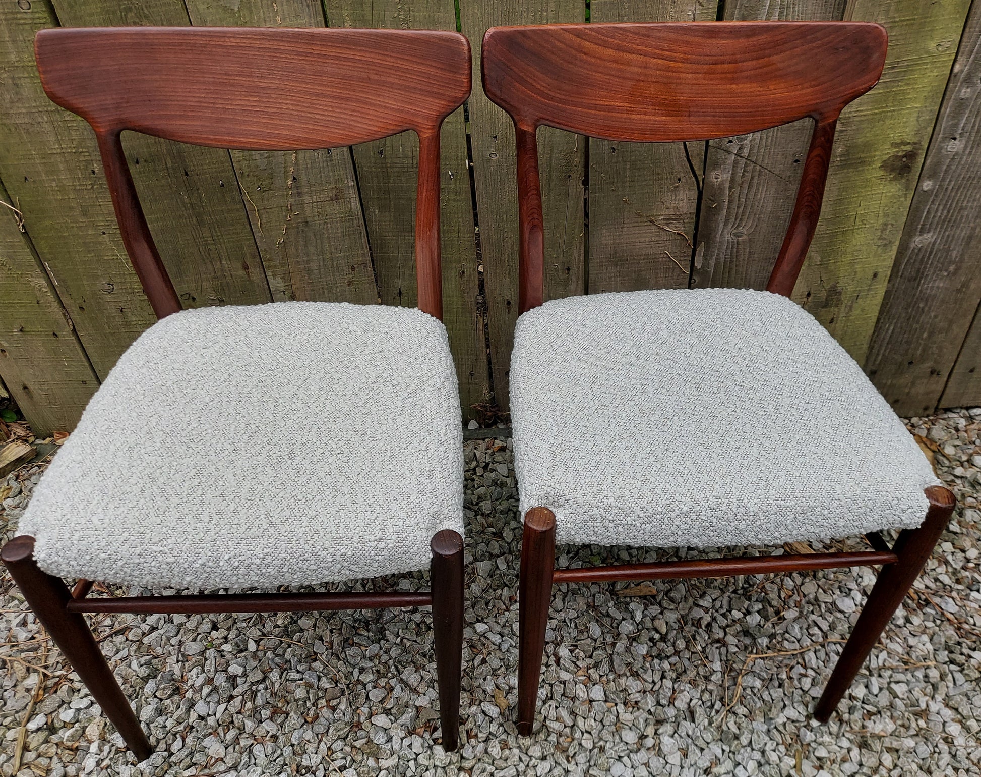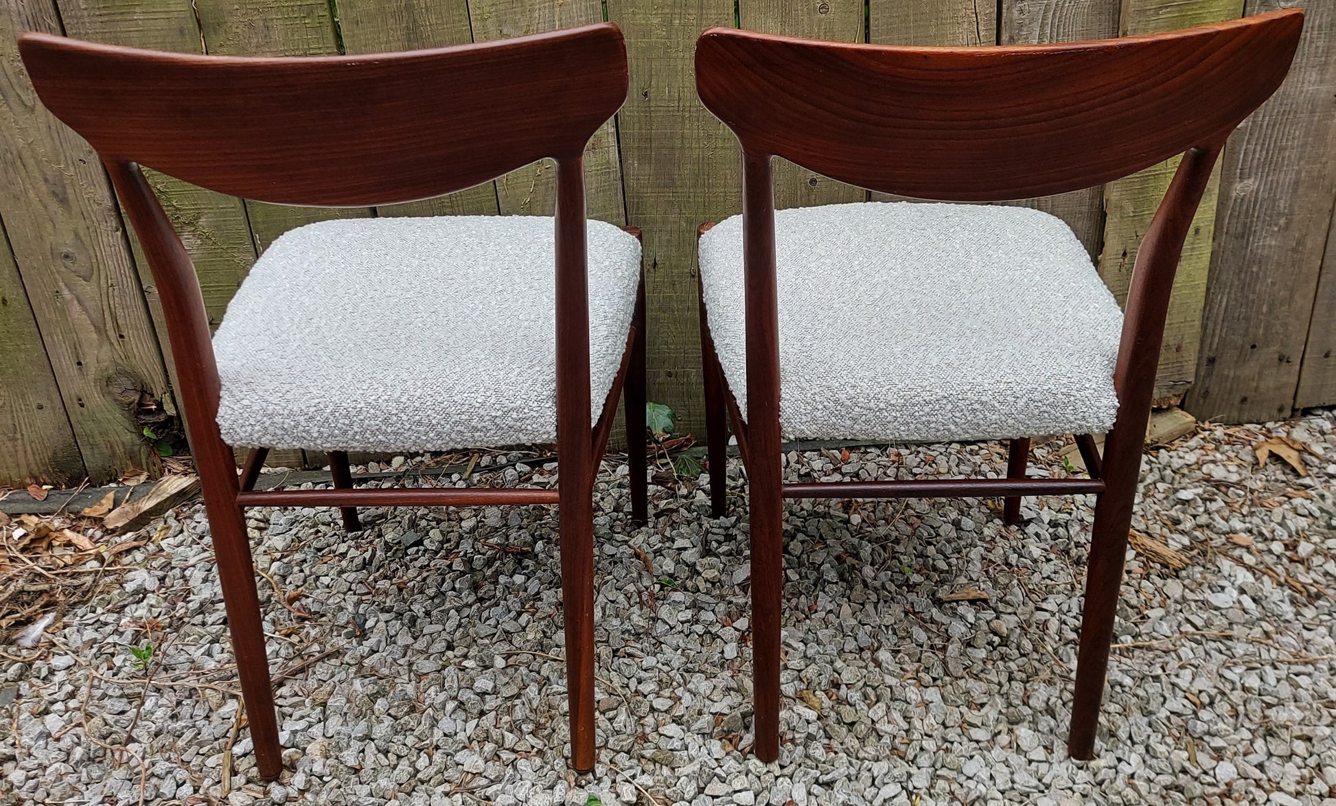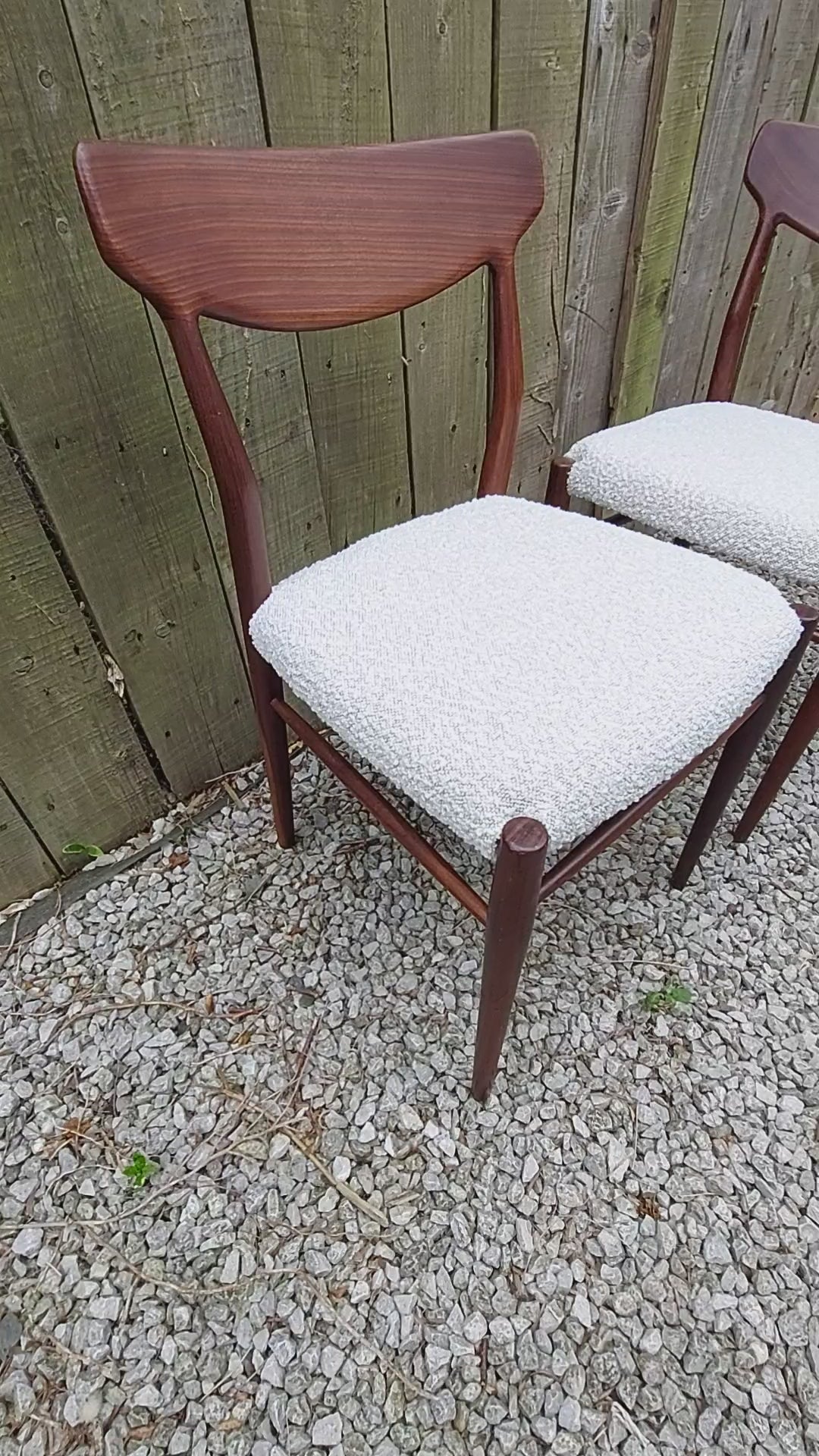 There are no labels but i believe this to be a Set of 2 Harry Østergaard dining chairs produced by Randers Møbelfabrik, Denmark in the early 1960s. I am currently updating the seat pads and covers to meet current fire regulations with new foam and ivory bouclé .