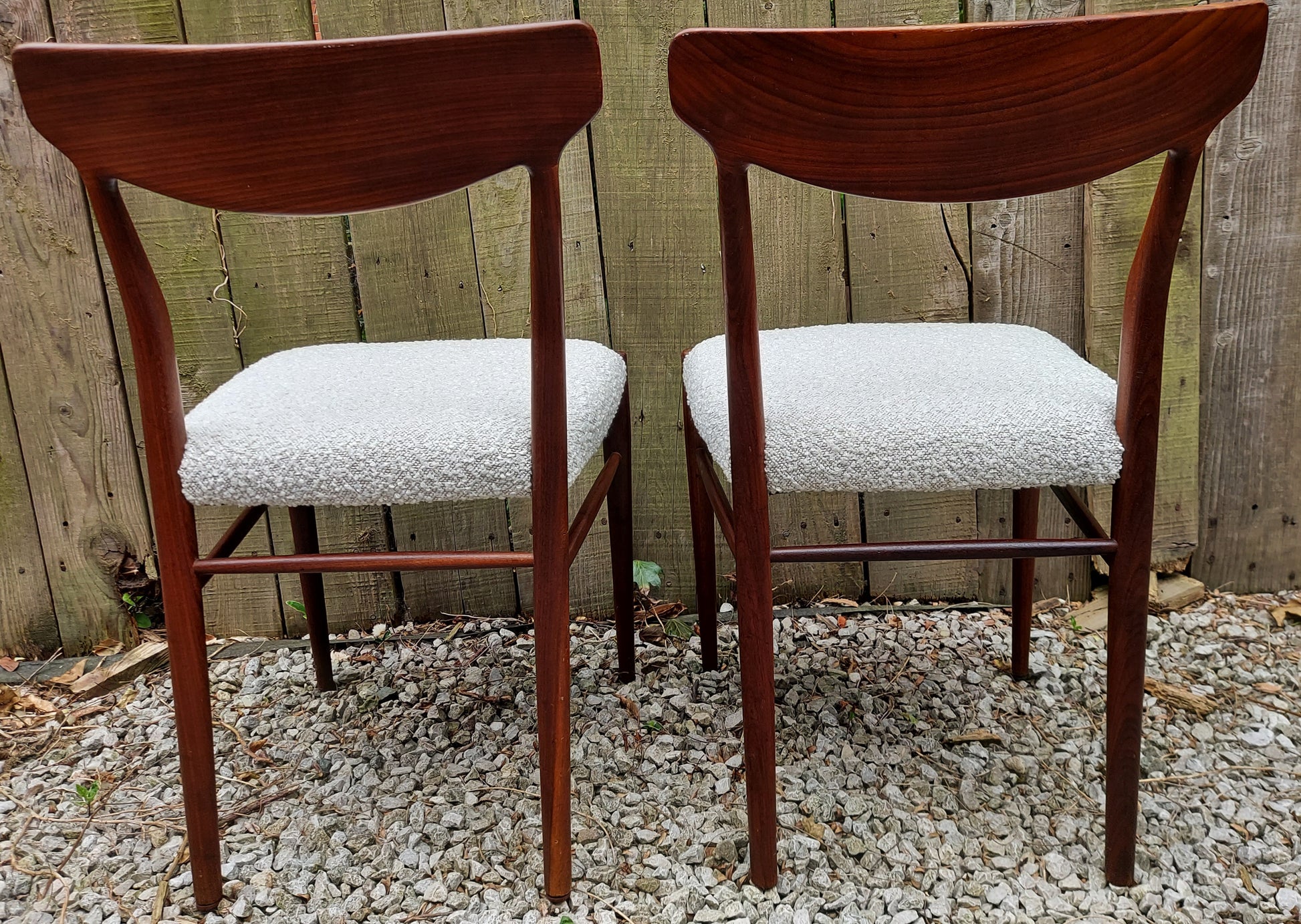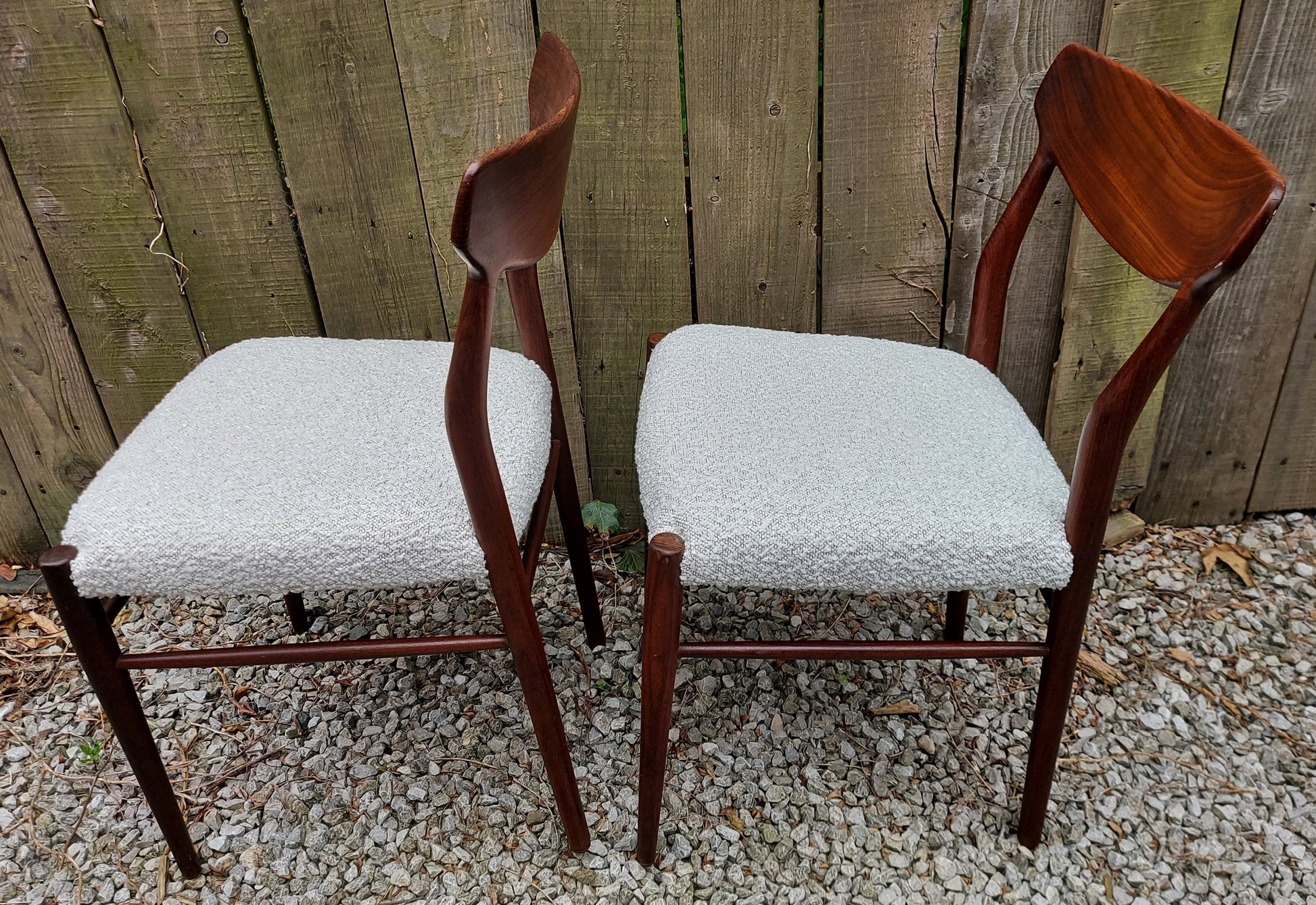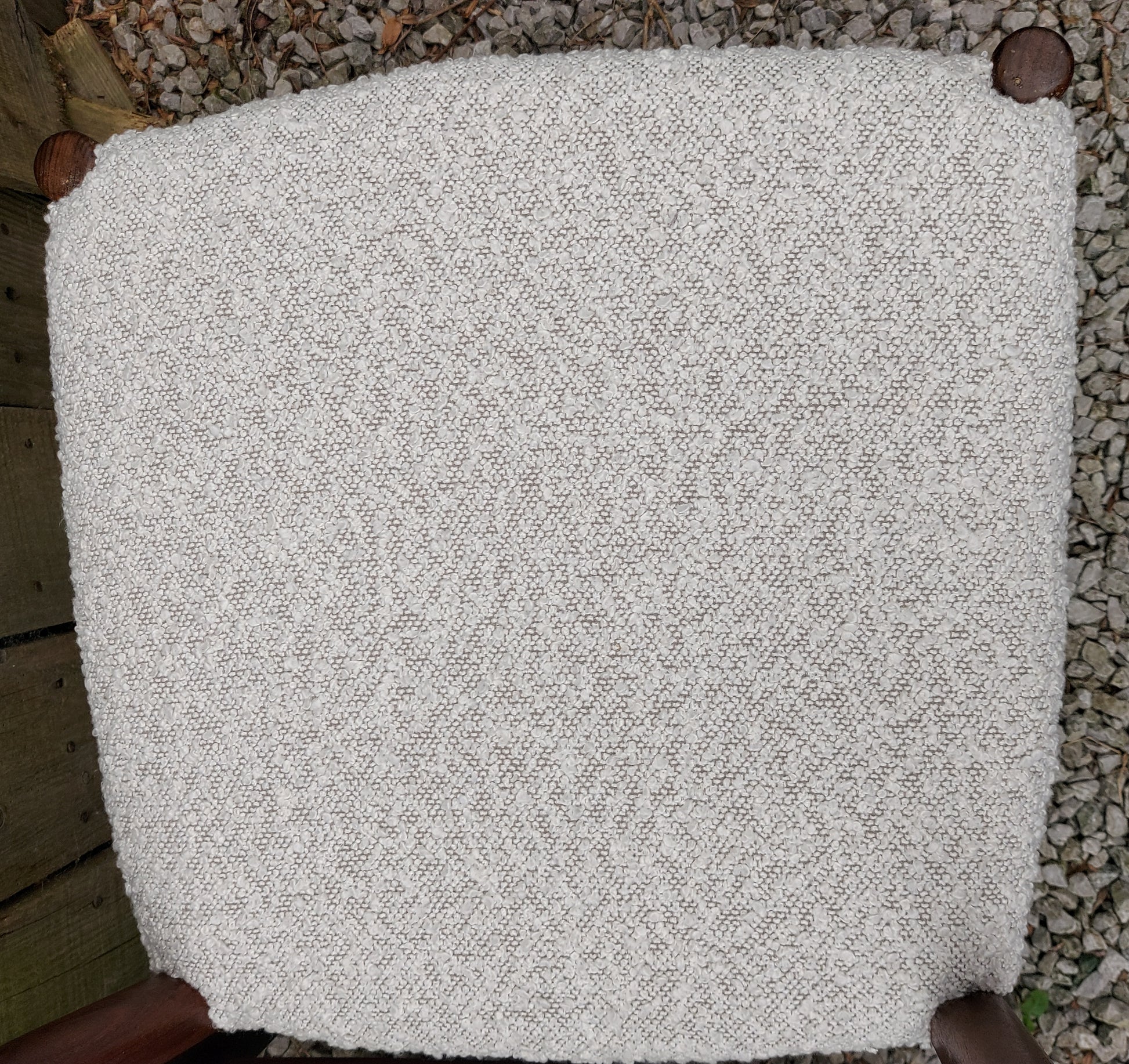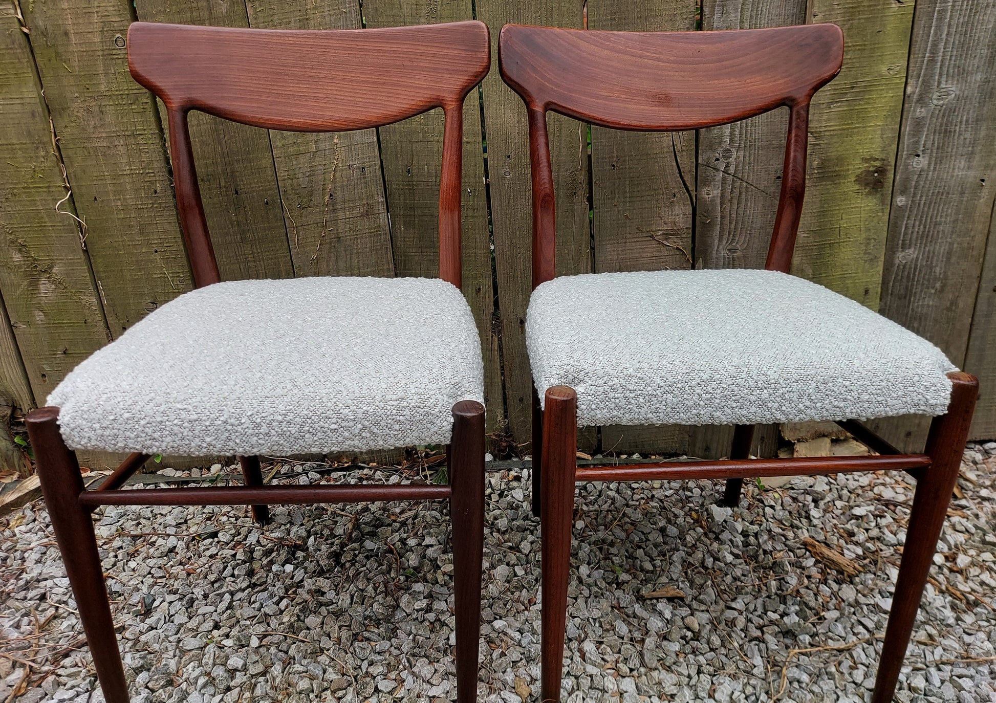 There are no labels but i believe this to be a Set of 2 Harry Østergaard dining chairs produced by Randers Møbelfabrik, Denmark in the early 1960s. I am currently updating the seat pads and covers to meet current fire regulations with new foam and ivory bouclé .