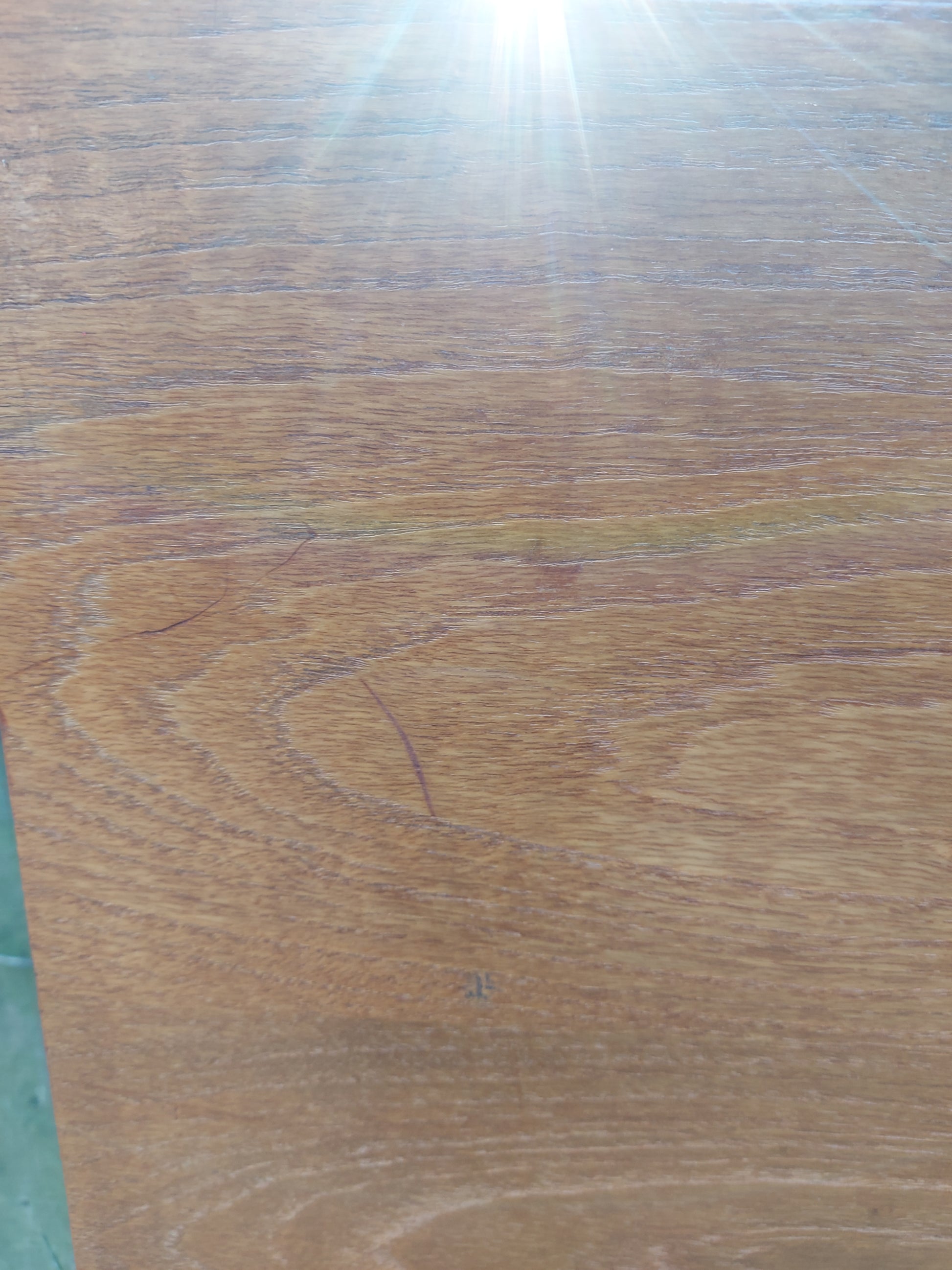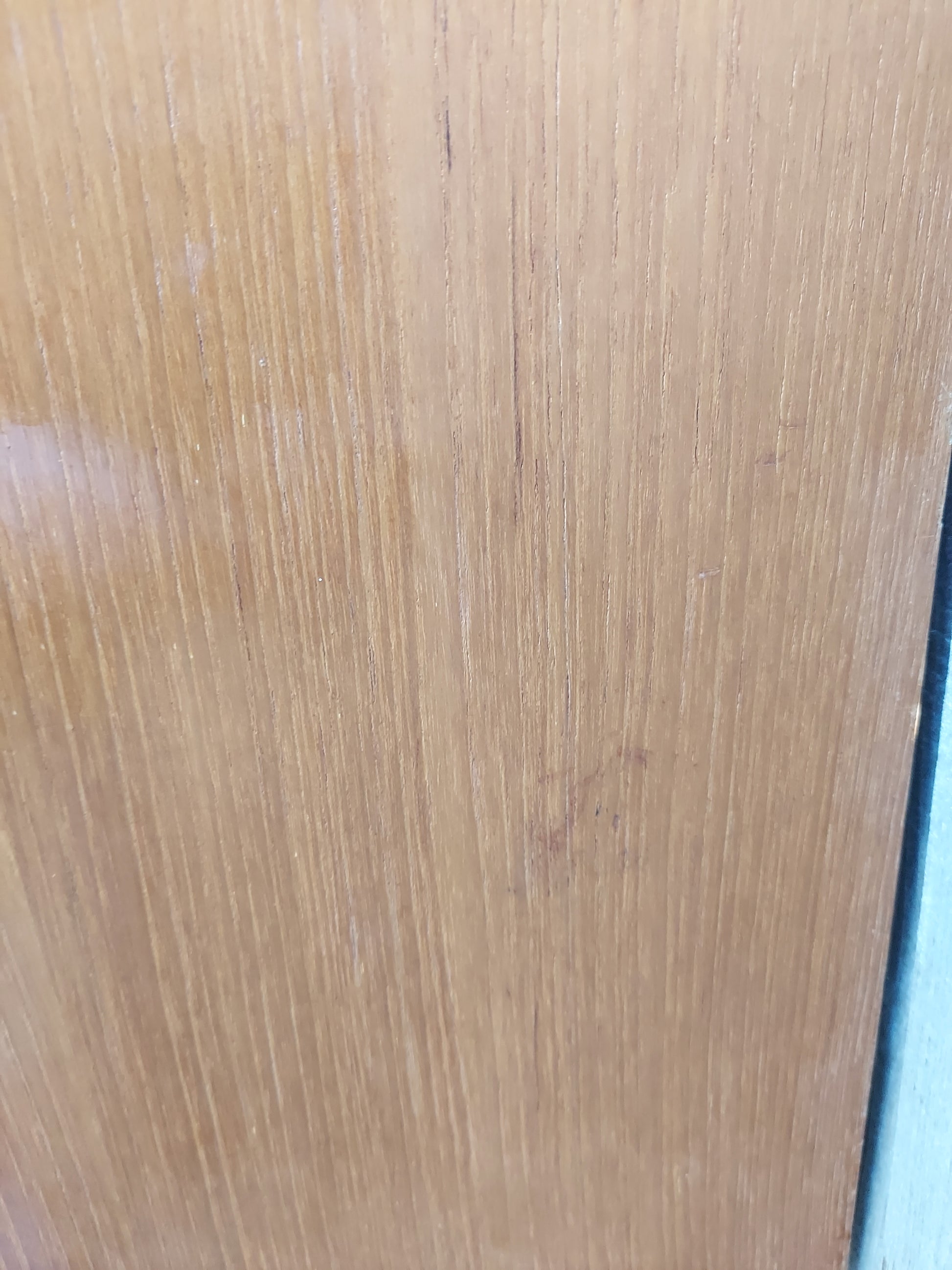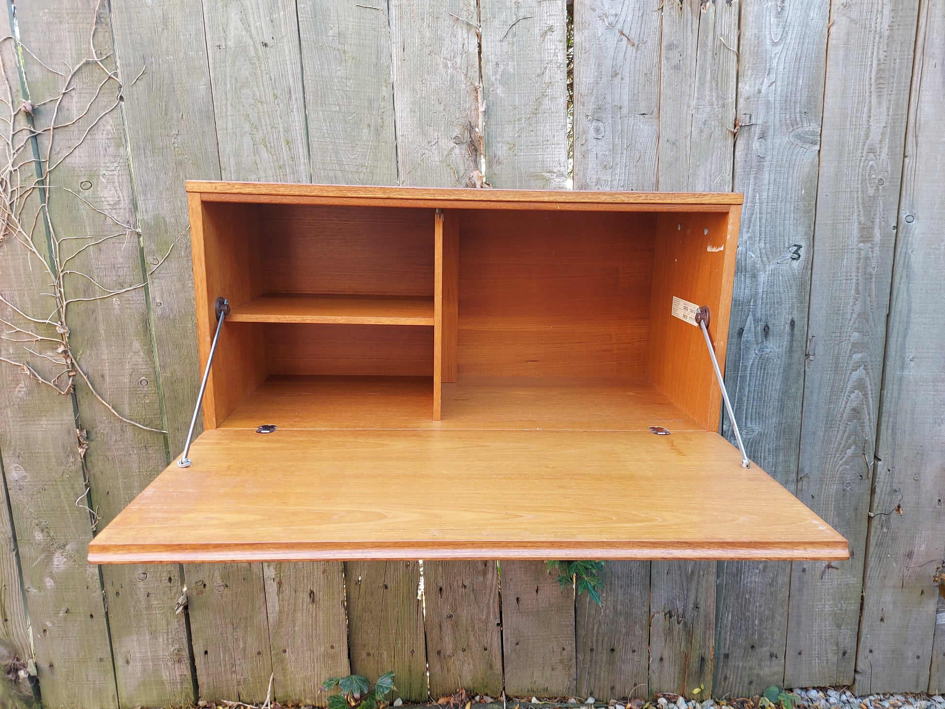 This is a preloved item so may show some signs of wear and tear consistent with its age and use. There are a few surface scratches as shown in the pictures. There are a few small veneer chips. One of the grub screws is missing from one of the arms on the desk. I have replaced a missing grub screw on one of the arms with a split pin to hold it. There is a light fitting bit i dont know if it works as the plug is removed. One of the wall spacing screws and part of the cupboard back has broken off.