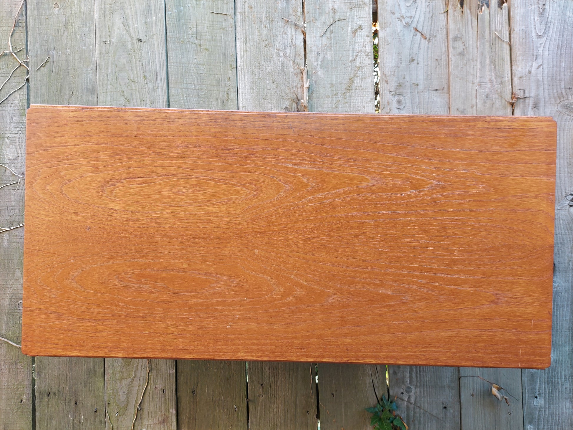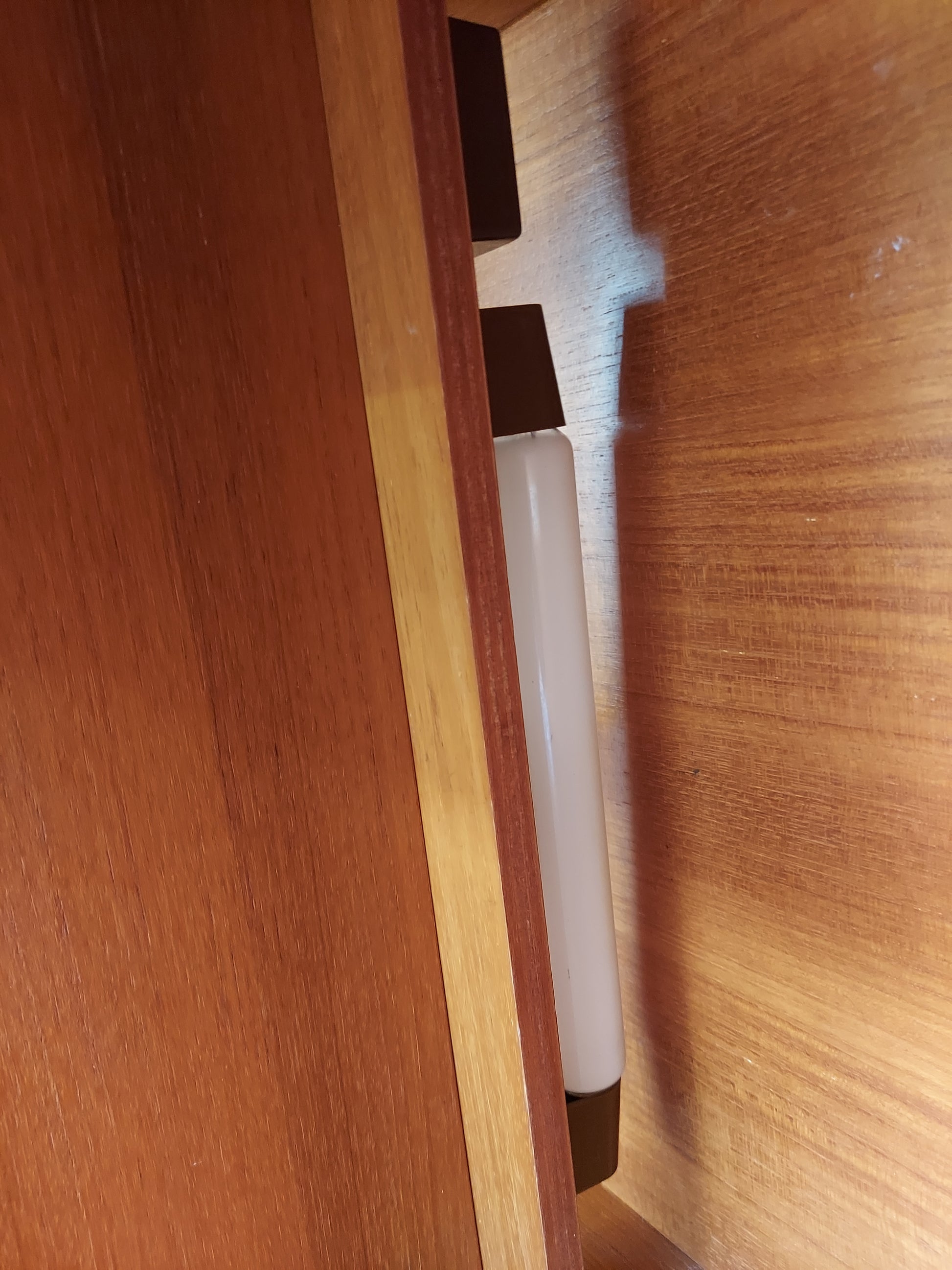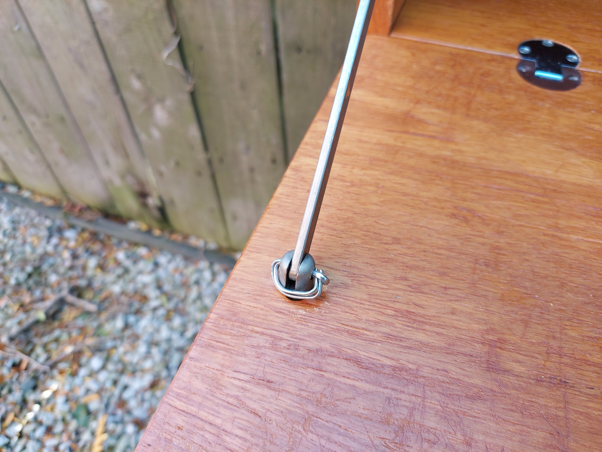 This is a preloved item so may show some signs of wear and tear consistent with its age and use. There are a few surface scratches as shown in the pictures. There are a few small veneer chips. One of the grub screws is missing from one of the arms on the desk. I have replaced a missing grub screw on one of the arms with a split pin to hold it. There is a light fitting bit i dont know if it works as the plug is removed. One of the wall spacing screws and part of the cupboard back has broken off.