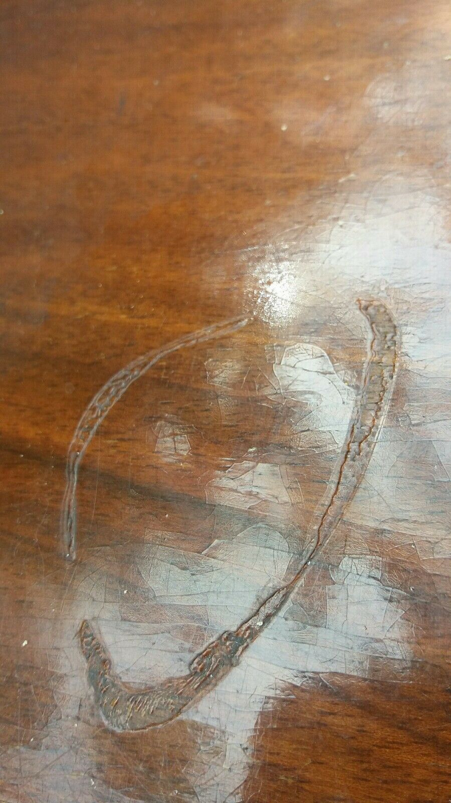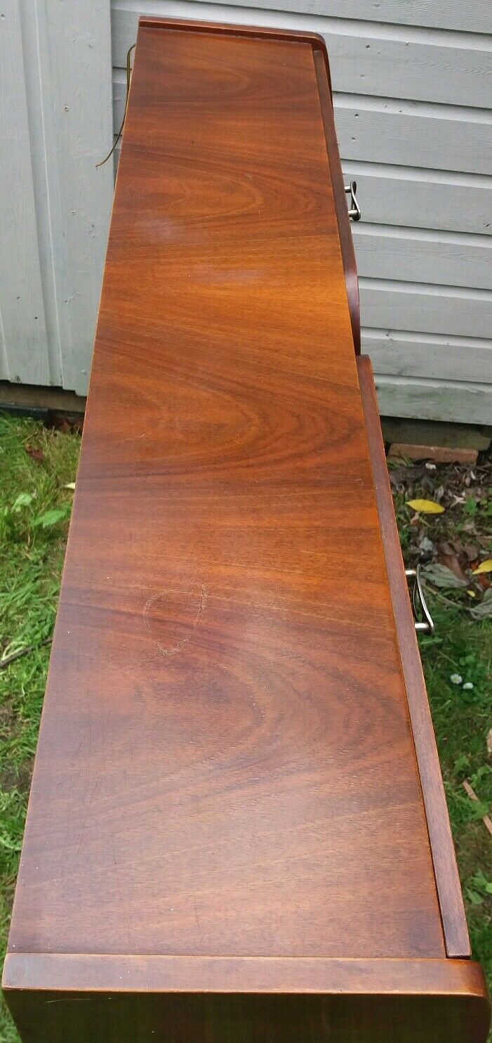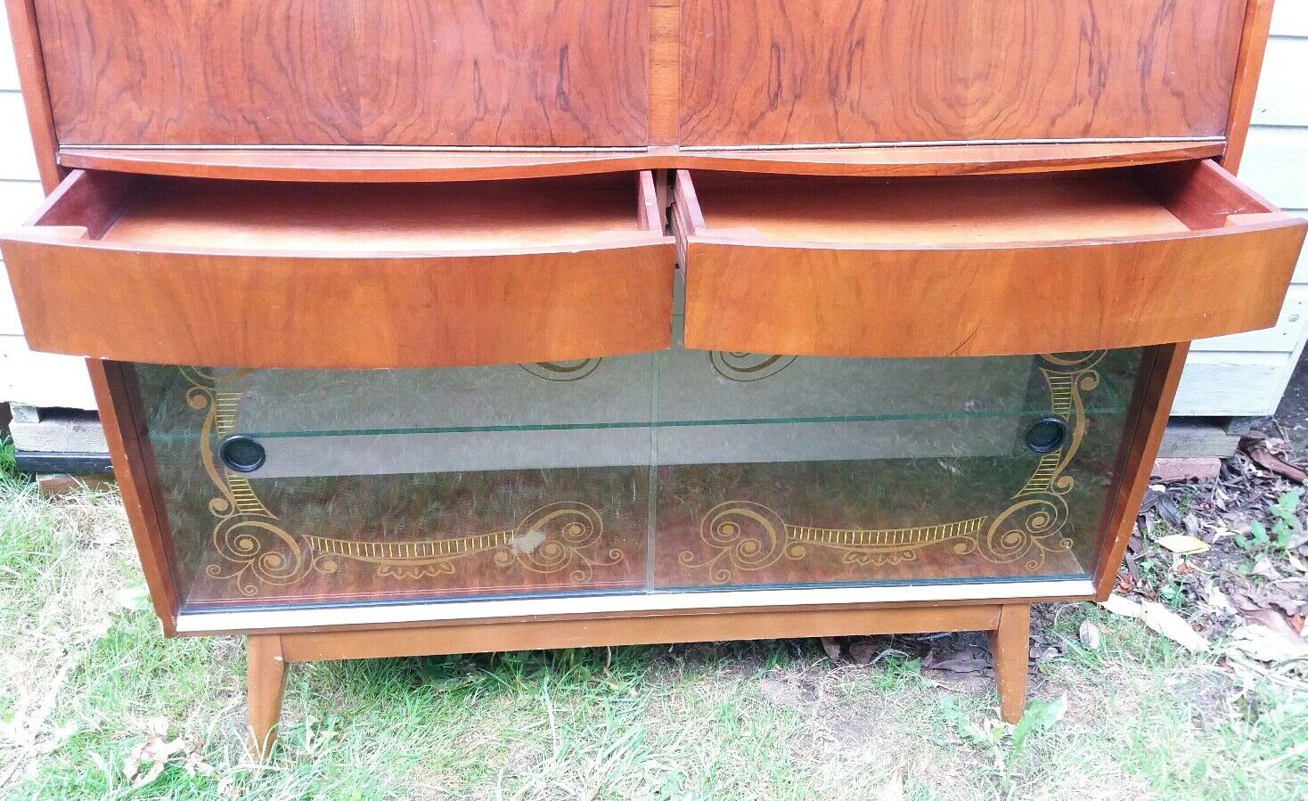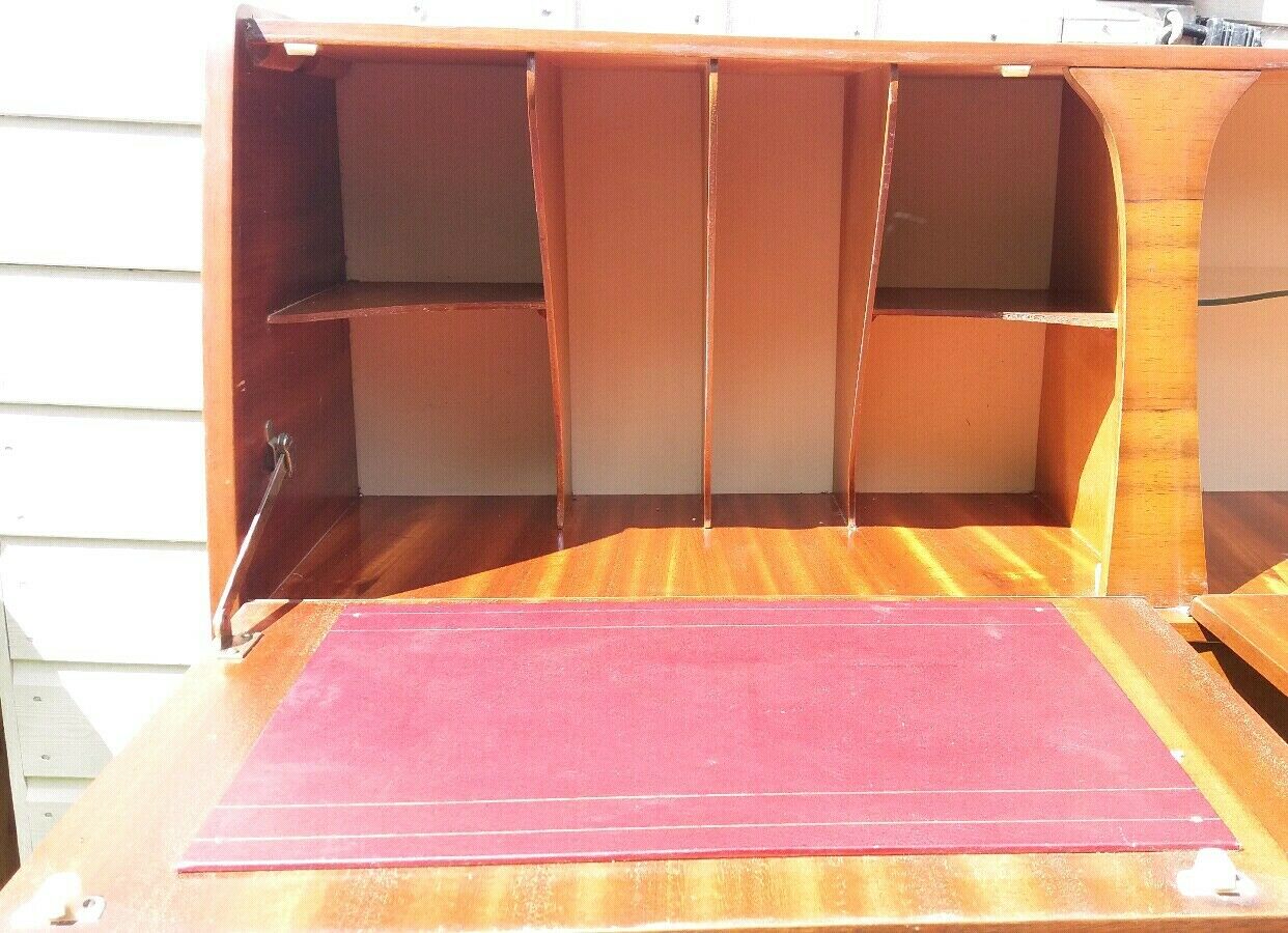 Lovely Mcm Bureau/Drinks Cabinet. I can't find a makers mark but I believe it to be Hubbinet. The bottom half is a display cabinet with a lovely painted design on the sliding glass doors. The fantastic wood veneer shows of a beautiful grain and has a laquer finish to it so makes it very hard wearing. It also has the original light fitting but the wire has been cut so this would need checking. It measures approx 105.5cm wide by 107 cm tall and 32cm deep at the deepsest part, the drawers. This is a preloved item so may show some signs of wear and tear with its age and use as a bureau. The laquer has a slight melted mark to the top and there is a little marking inside one of the cabinets which I have shown in the pictures. But none of this detracts from its use and retro loveliness. |