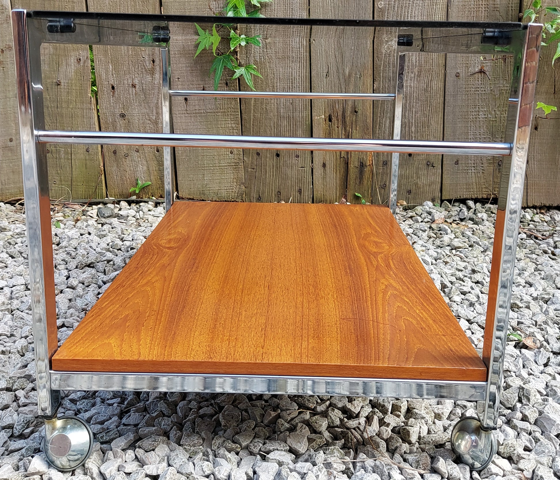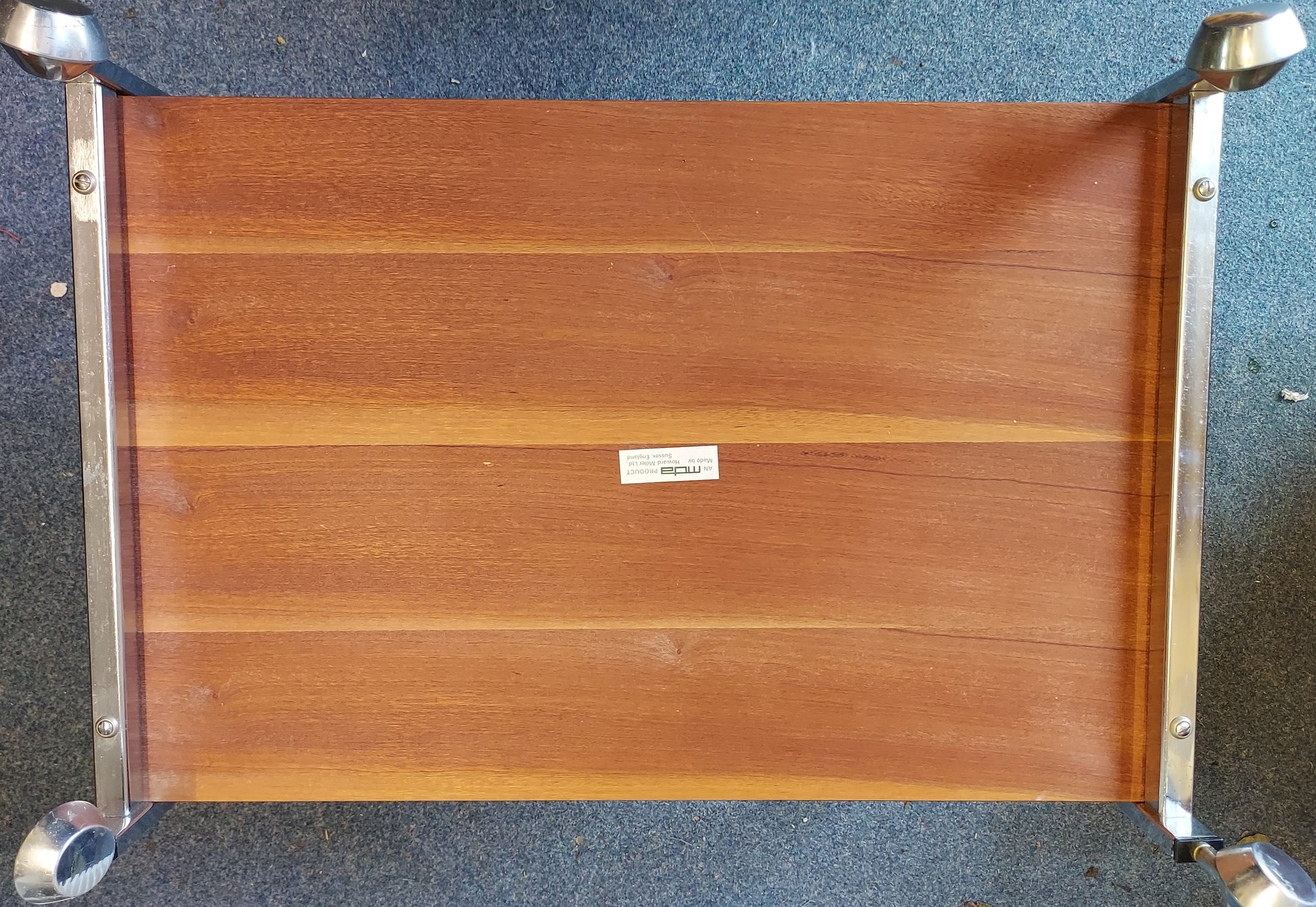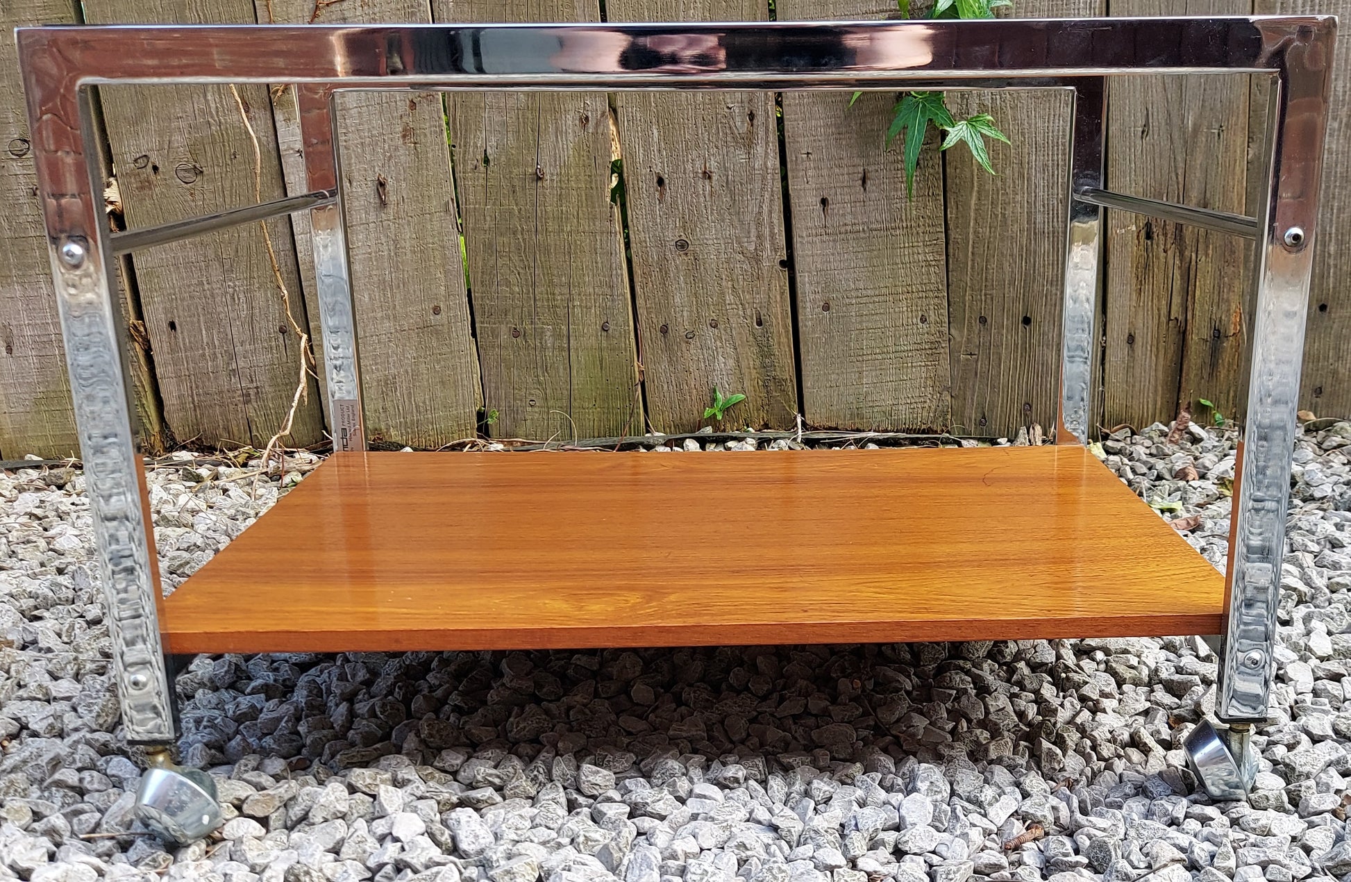 fabulous MDA products low table on wheels manufactured in the 1970s by Howard Miller (Sussex) UK. Chromed metal, teak veneered timber, transparent smoked grey glass, castors. I will be sending the table flat packed so some self assembly would be needed