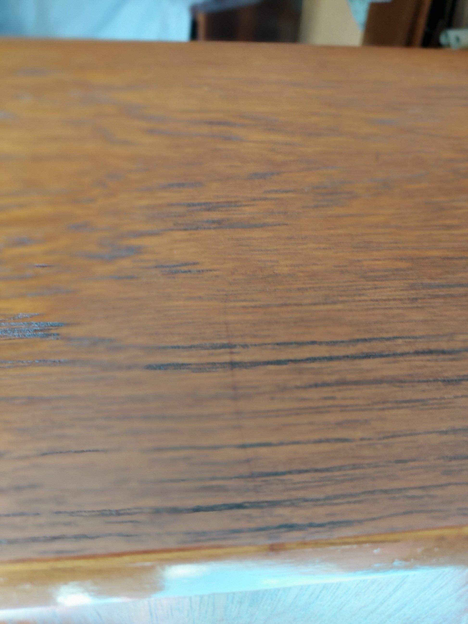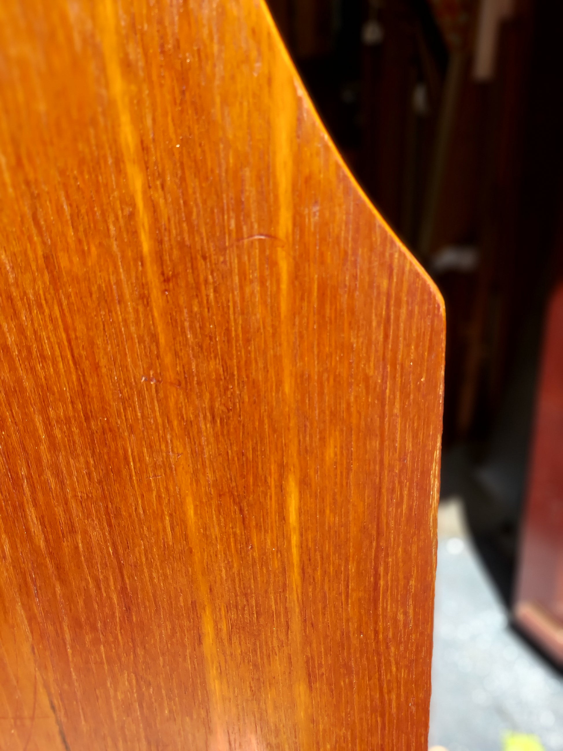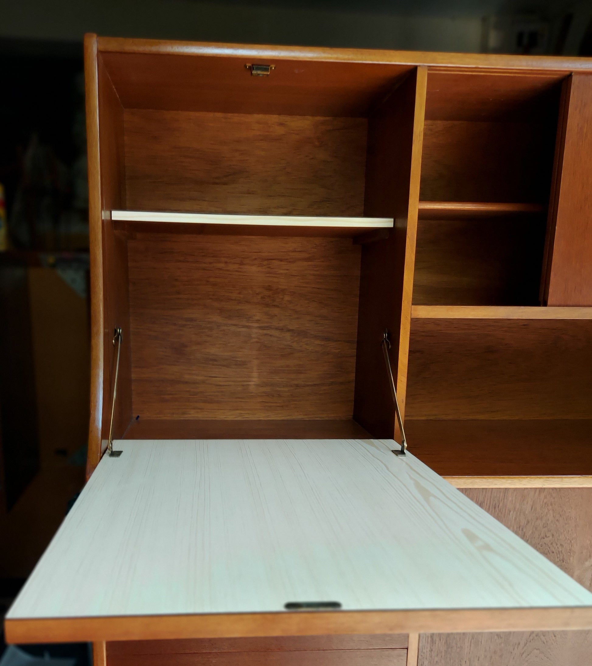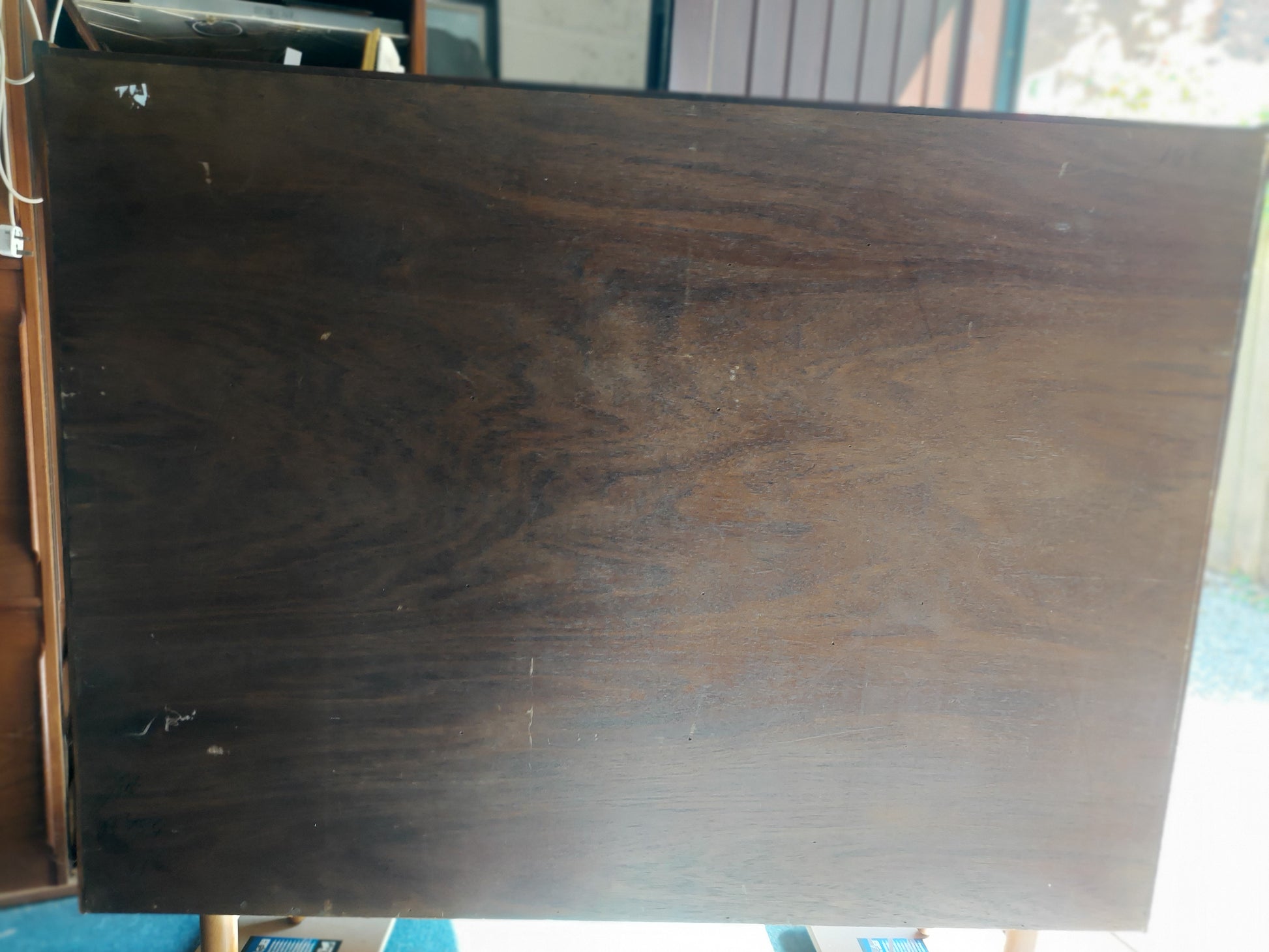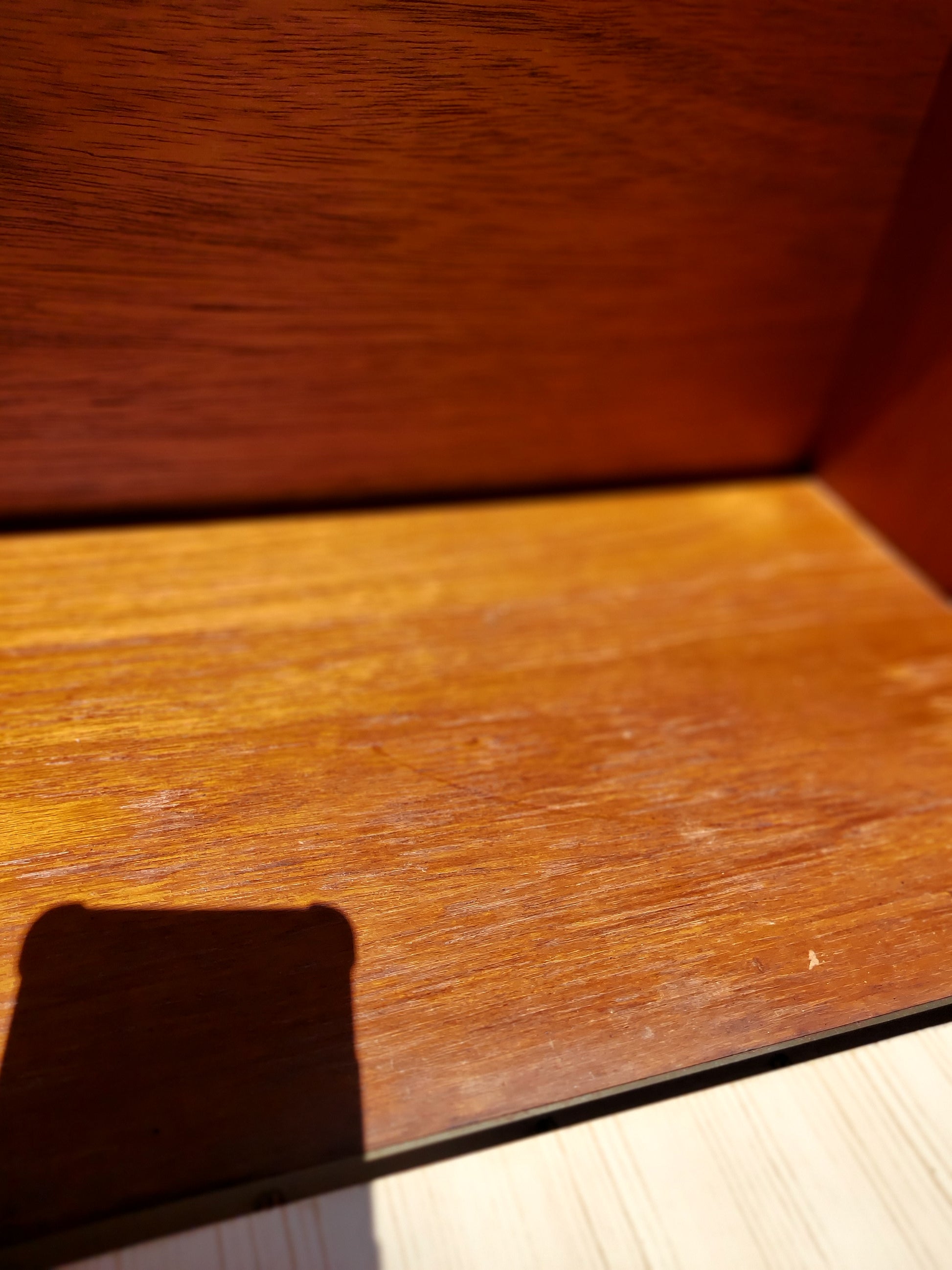 This is a preloved item so may show some signs of wear and tear consistent with its age and use. There are some long surface scratches to the left side and a few smaller surface scratches to the top, right side and sliding doors as I have shown in the photos. One of the legs was a little wobbly so i have glued it and support it with a metal strip so it no longer wobbles and the metal plate cannot be seen from the outside of the sideboard. None of this detracts from its use and retro loveliness.