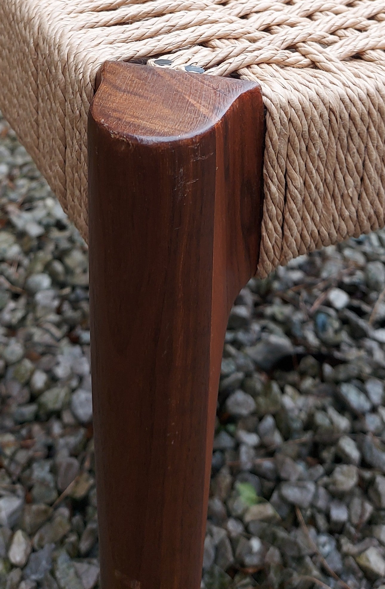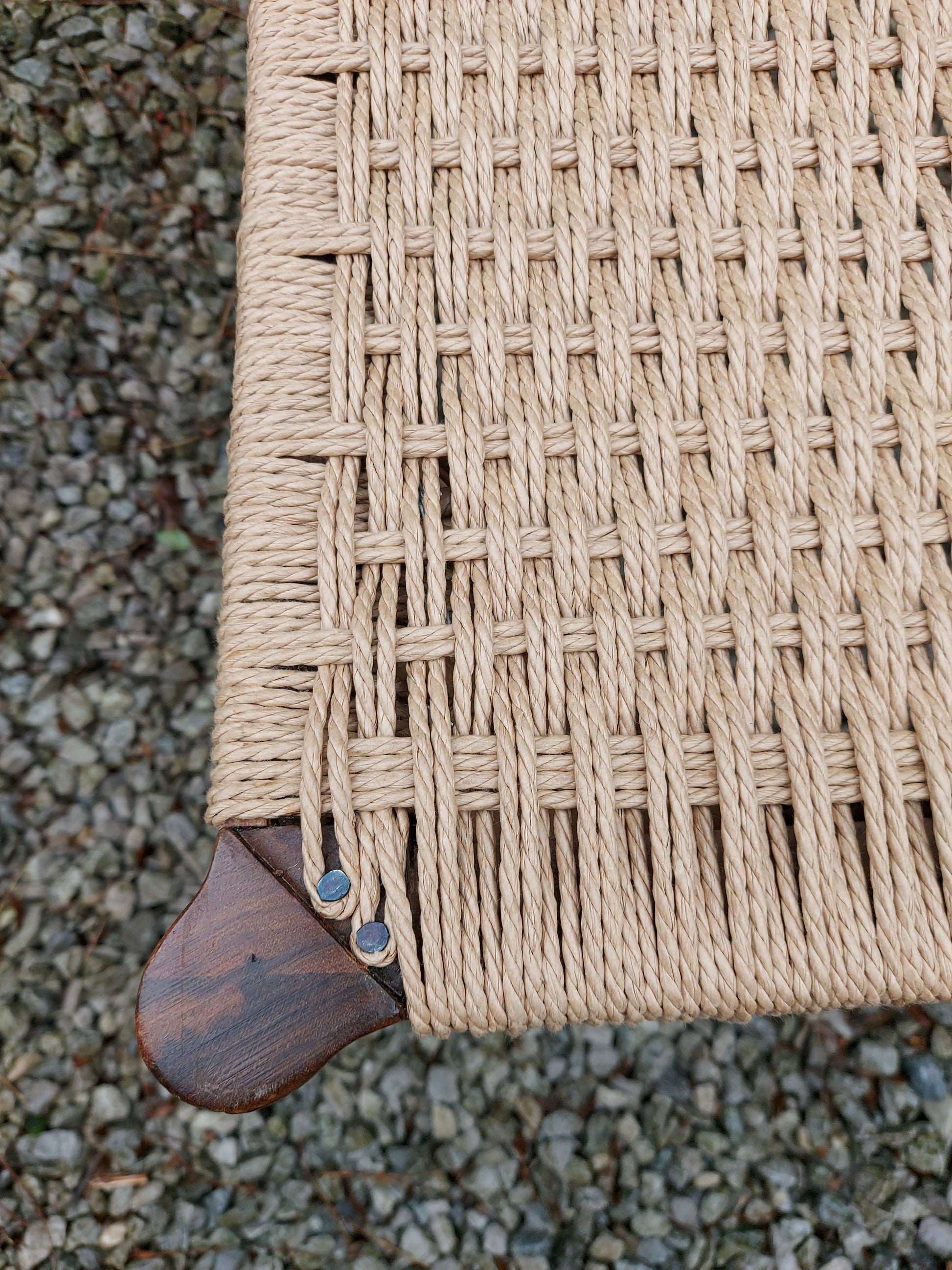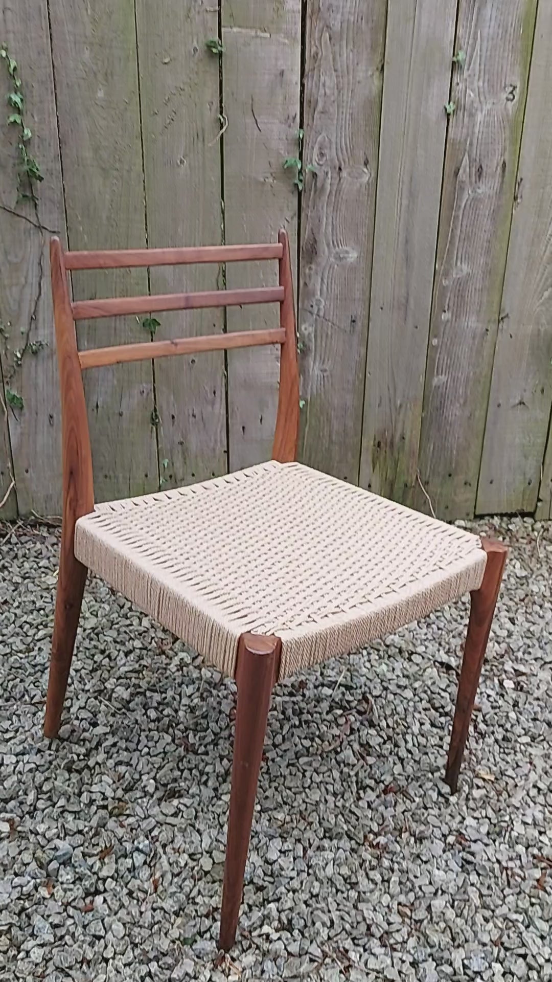 MCM Ladder Back Danish Papercord Statement/desk chair. This is a more recent reproduction of a danish style. The top of the front legs are flat and I've had to use tacks to secure the new papercord at the front as shown in the pics. I have newly recorded the chair with the laced danish papercord. It measures approx 51 cm wide at the front and 85cm tall at the back and 55 cm deep. The seat pad measures approx 49 cm wide by 46 cm deep And is 49 cm from the floor to the top. The frame is veneered as far as I can tell but not sure what wood it is.