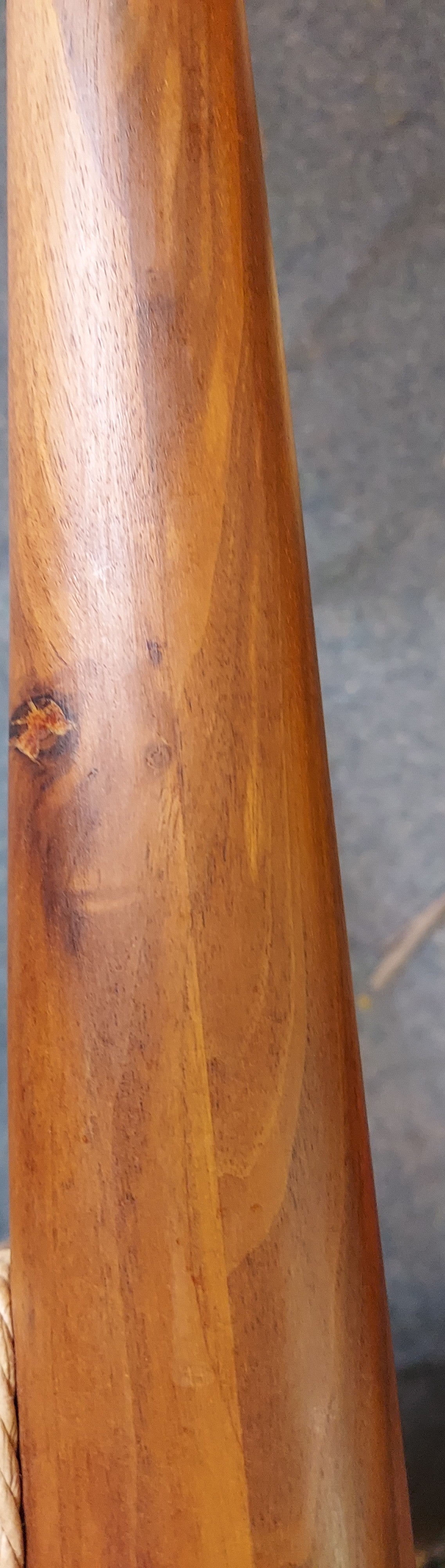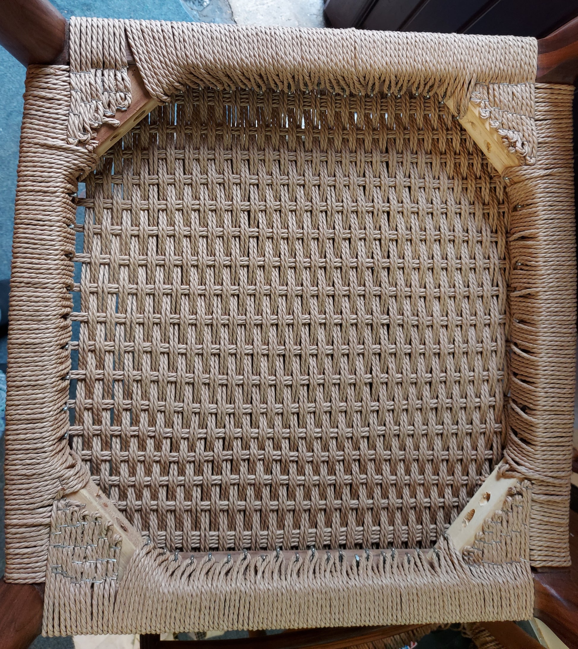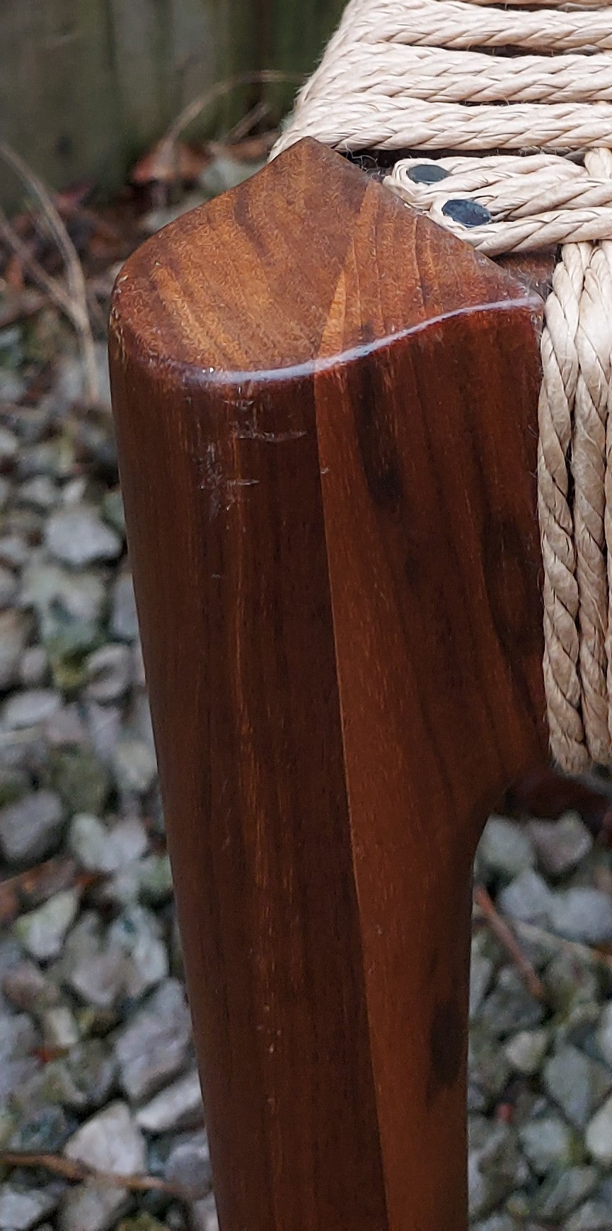 MCM Ladder Back Danish Papercord Statement/desk chair. This is a more recent reproduction of a danish style. The top of the front legs are flat and I've had to use tacks to secure the new papercord at the front as shown in the pics. I have newly recorded the chair with the laced danish papercord. It measures approx 51 cm wide at the front and 85cm tall at the back and 55 cm deep. The seat pad measures approx 49 cm wide by 46 cm deep And is 49 cm from the floor to the top. The frame is veneered as far as I can tell but not sure what wood it is.