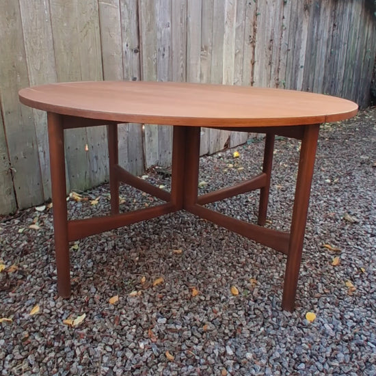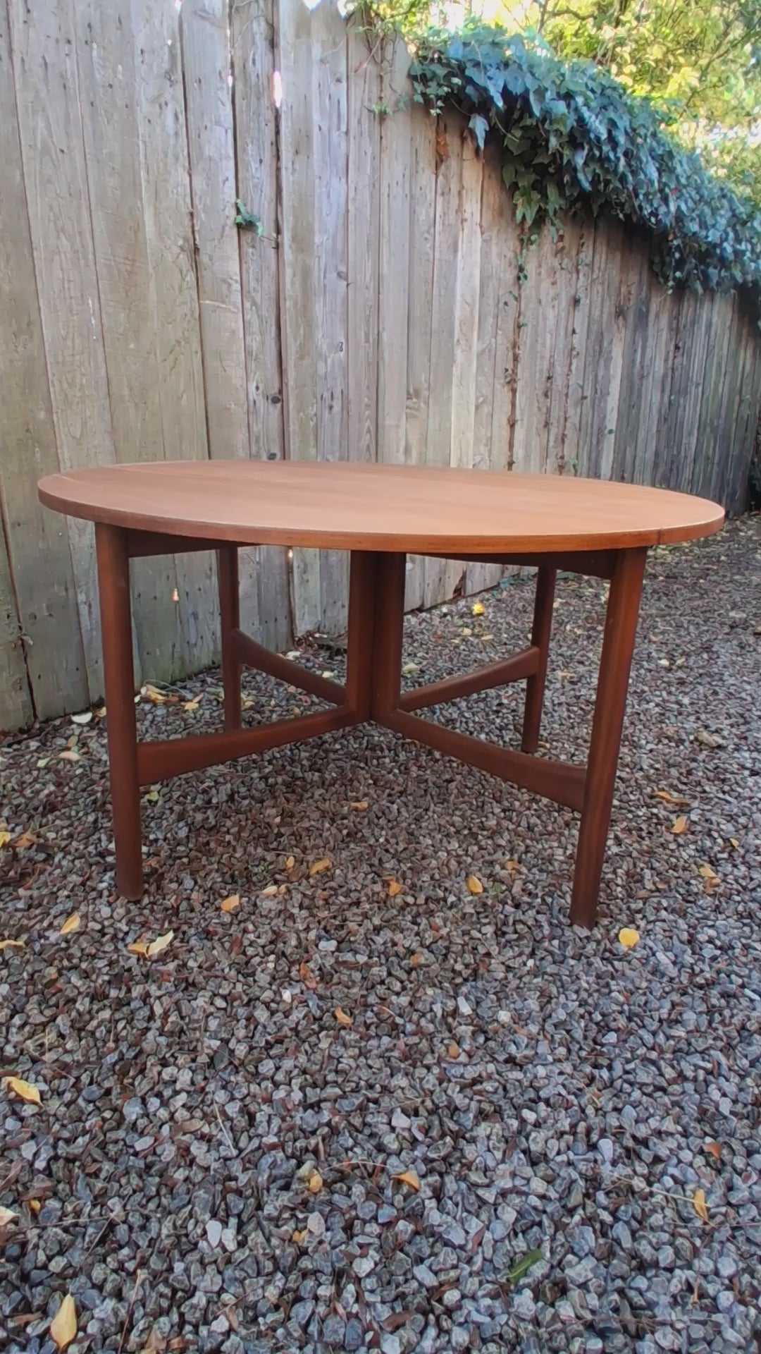 Mid Century Modern Beithcraft round dropleaf extending table. The table measures approx 132 cm deep by 74 cm tall and 47.25 cm wide extending to 132.5 cm. I have sanded down the top surface and applied several layers of osmo wax oil to protect the surface and enhance the wood grain.