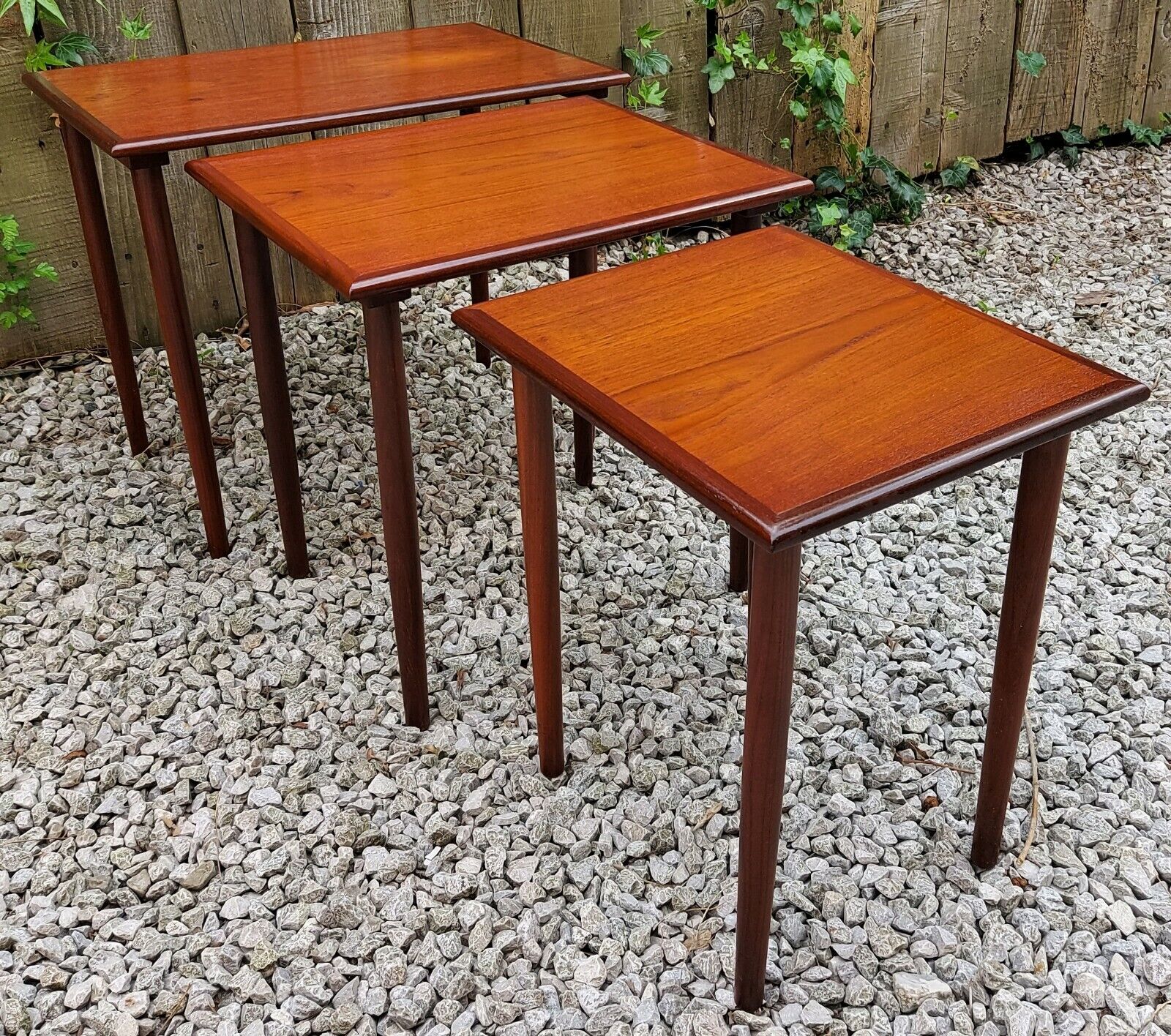 Mid Century Modern Danish Nest of Tables. The nest measures approx 57.5 cm long by 39 cm deep and 48.5 cms tall. The legs unscrew and will be removed for postage so some self assembly will be needed by the buyer
