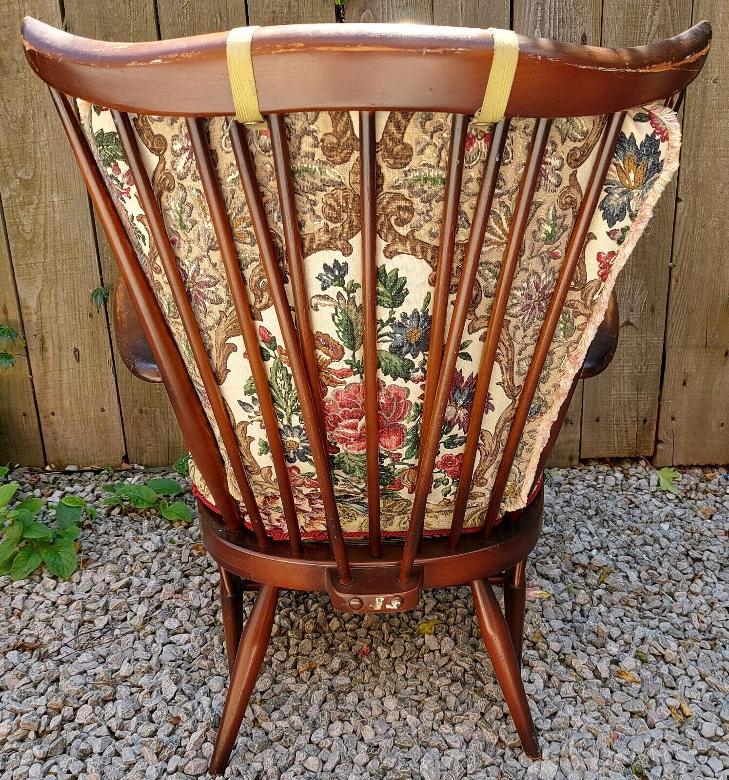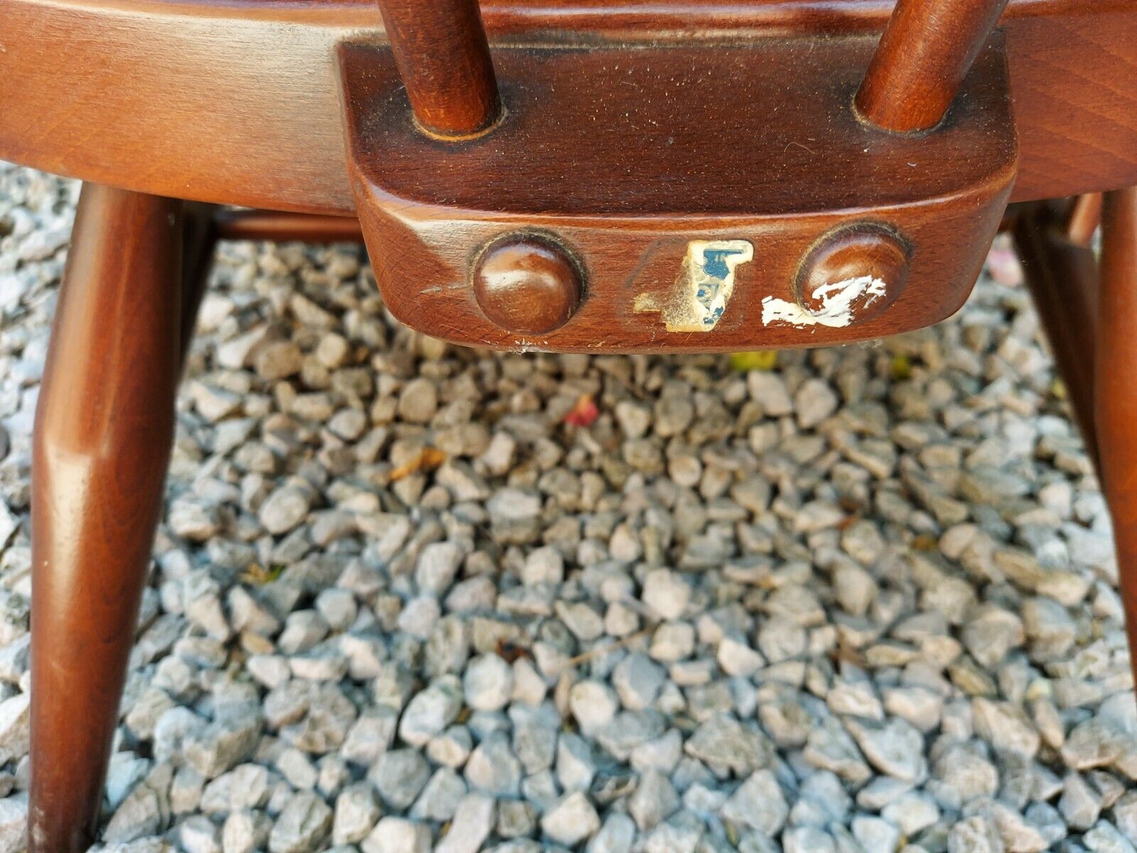 This is a preloved item so may show some signs of wear and tear consistent with its age and use.  The webbing has been redone previously but by using tacks rather than the traditional method for ercol chairs.  There is some wear to the dark original finish.   None of this detracts from its use and retro loveliness. |