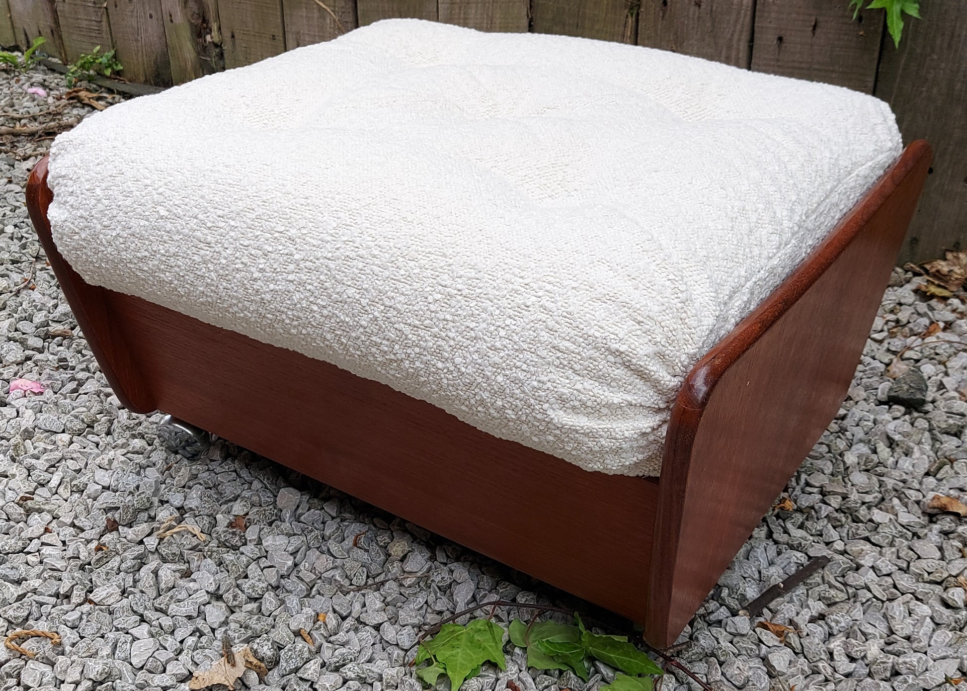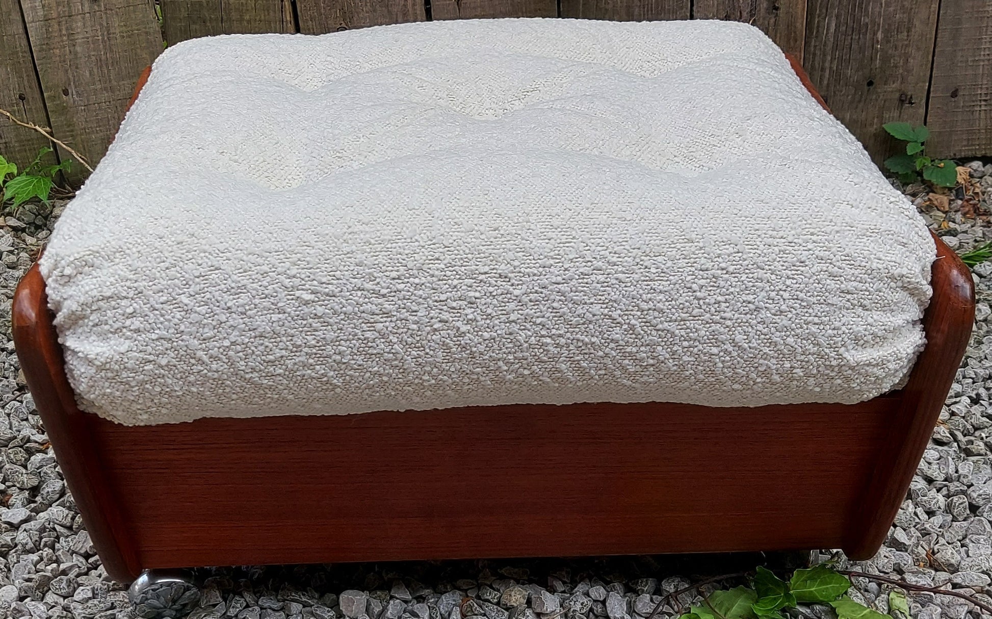 Mid Century Modern GPlan Teak Saddle Footstool ivory bouclé
