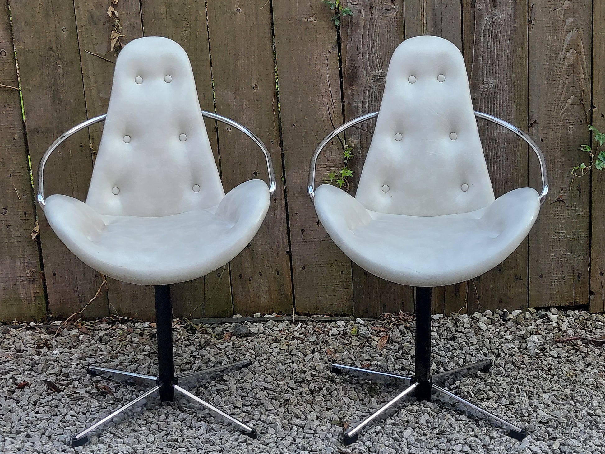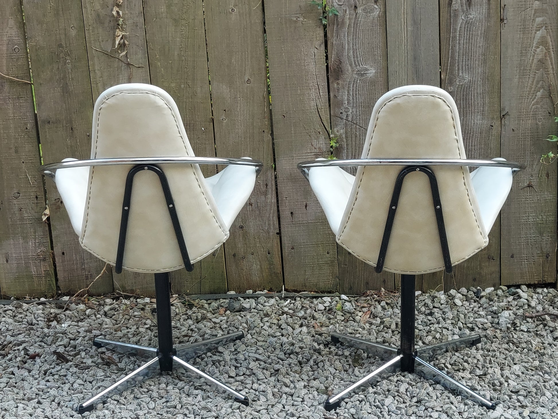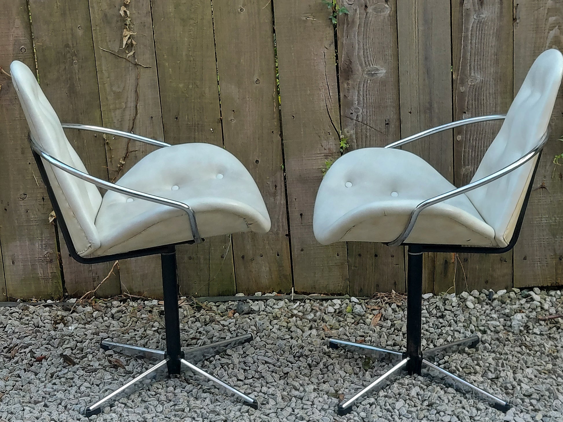mid century modern pair atomic style mottled cream vinyl swivel chairs. One of the chairs does not turn very easily so would probably be better used as a dining chair rather than an office chair.