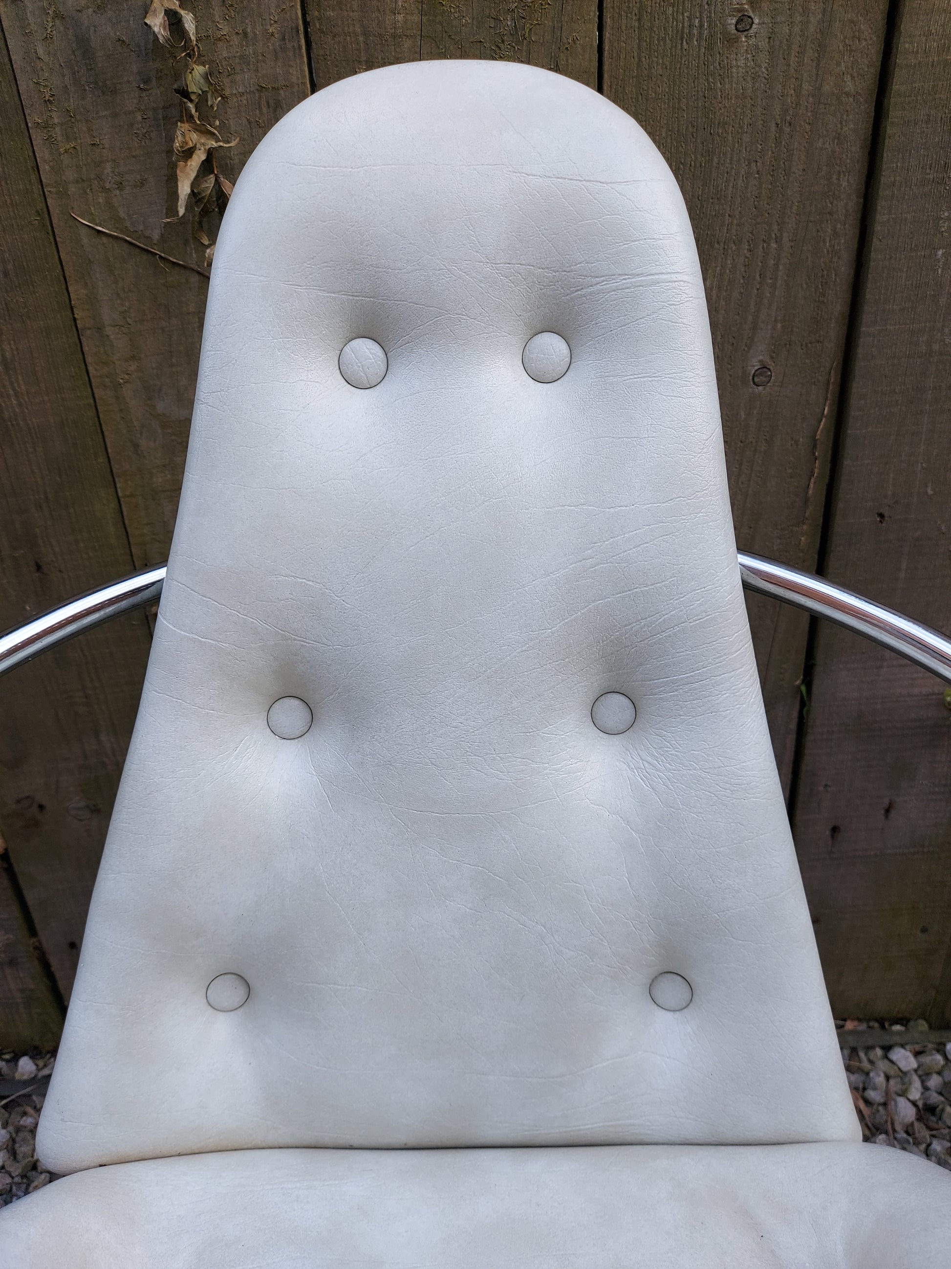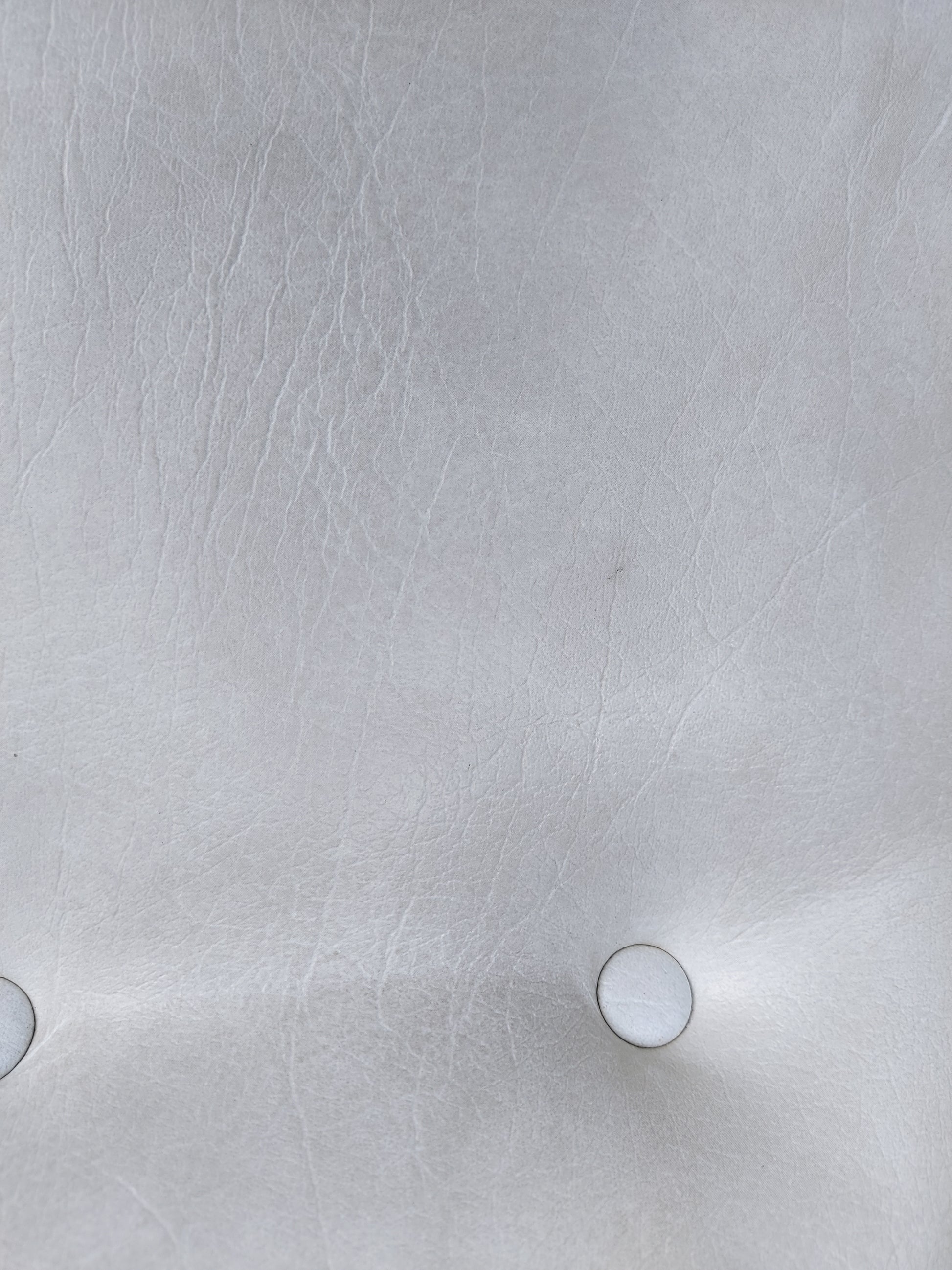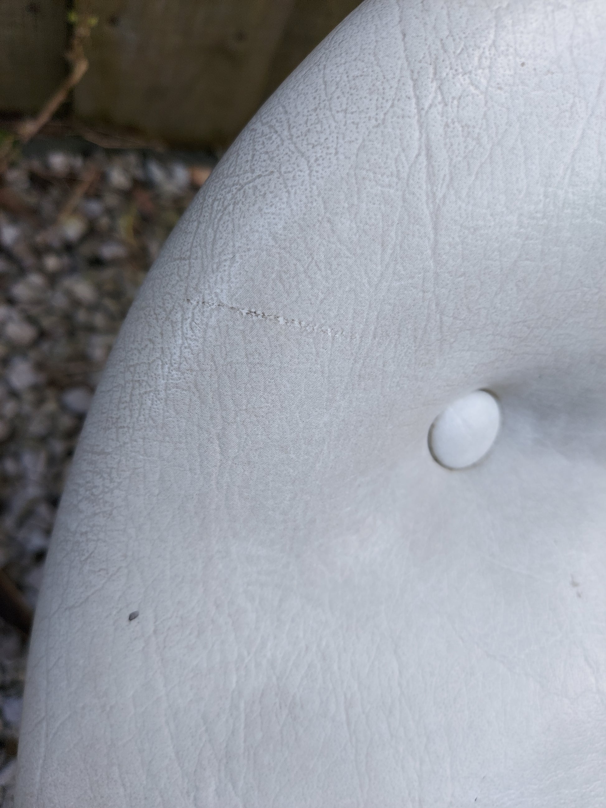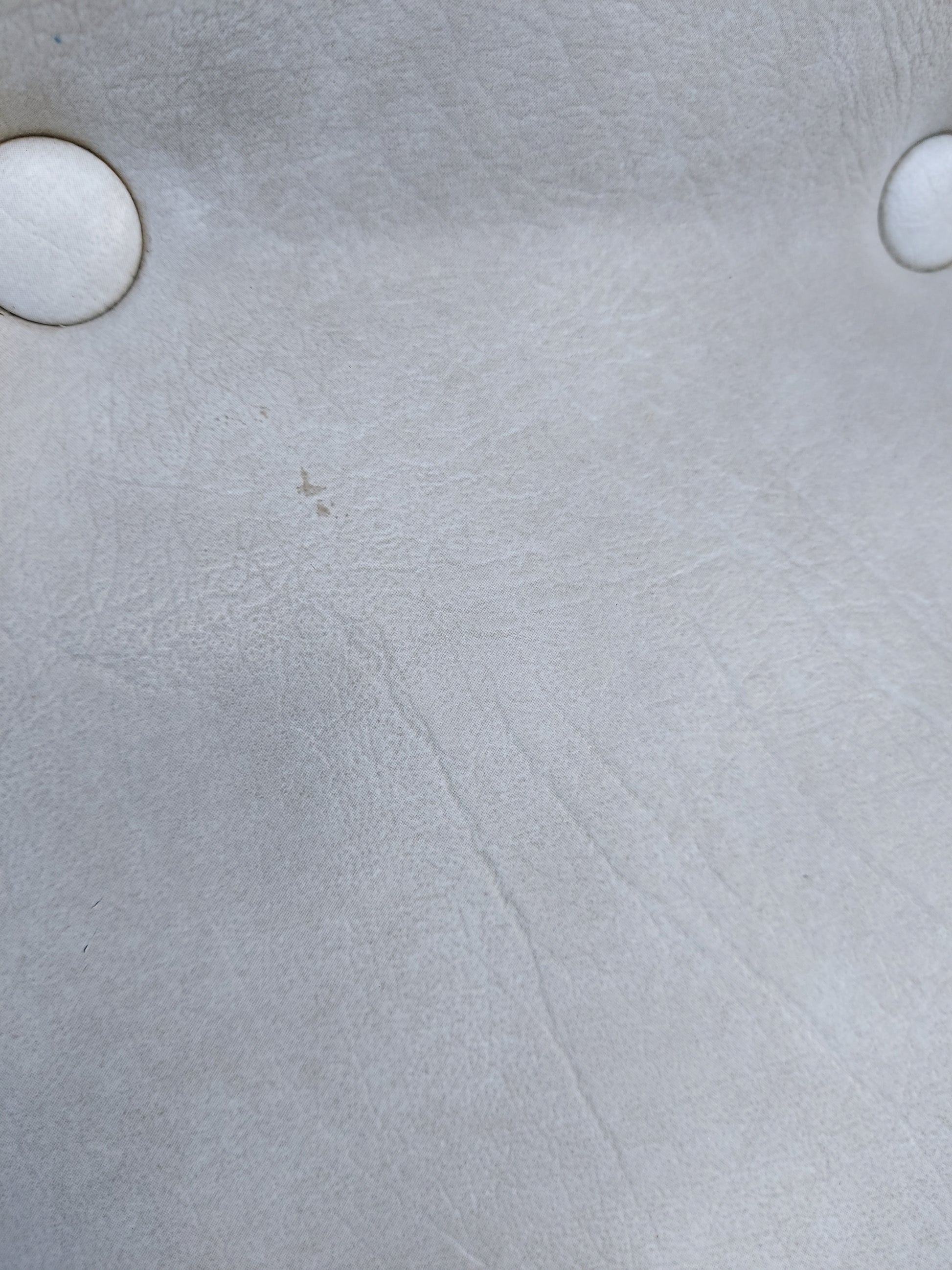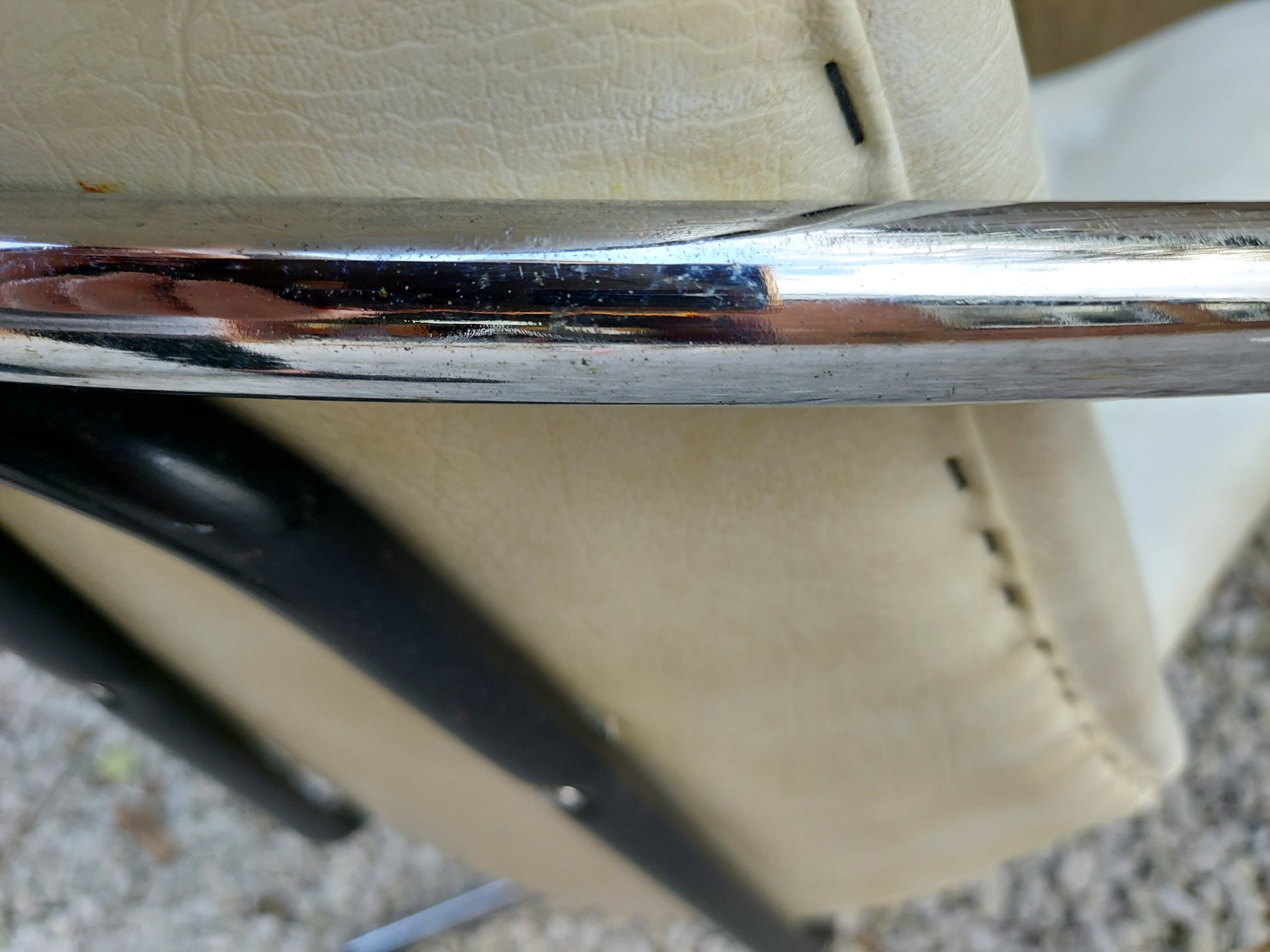 This is a preloved item so may show some signs of wear and tear consistent with its age and use. As previously stated one of the chairs is very stiff on rotation. There are a few surface marks to the vinyl but no rips and tears. There is a little pitting to the metal frame behind the seat backs. None of this detracts from its use and retro loveliness.