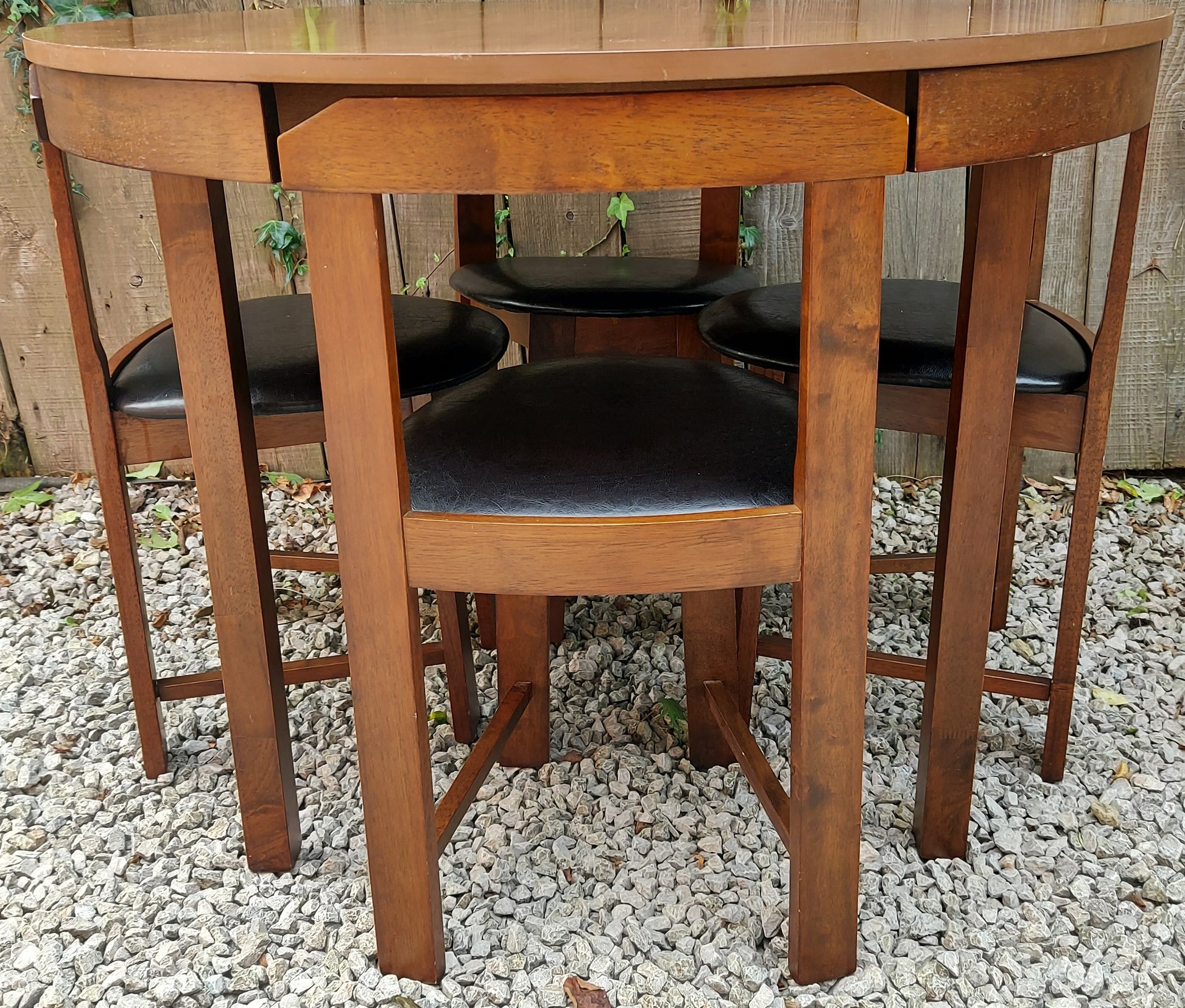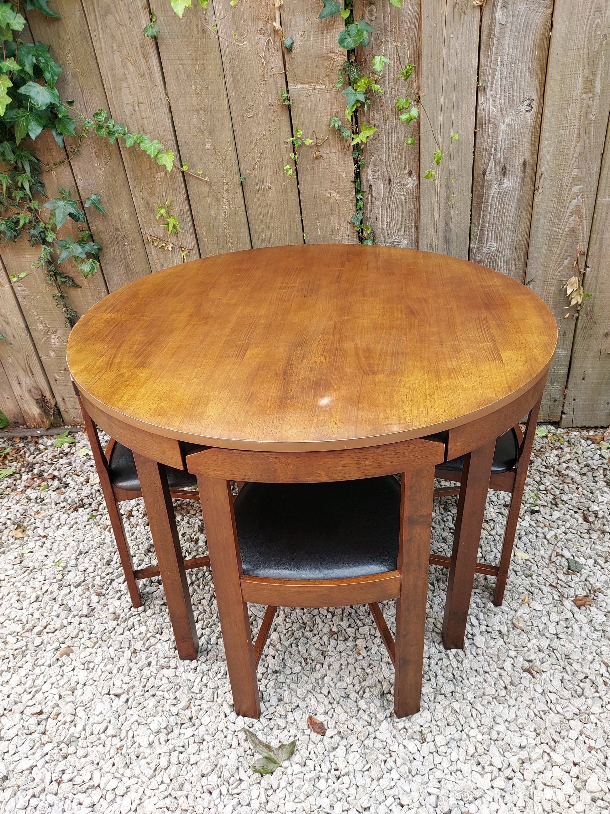 Modern 'Roundette' table with 4 tuck under chairs. This is a modern copy of a roundette table that was very popular in the 60s as a very stylish and space saving table and chair set. The legs for the table can be removed to make it easier to move around the house. The table measures approx 105.25 cm in diameter and is 78 cm tall. The table and chairs are wood effect rather than solid wood.