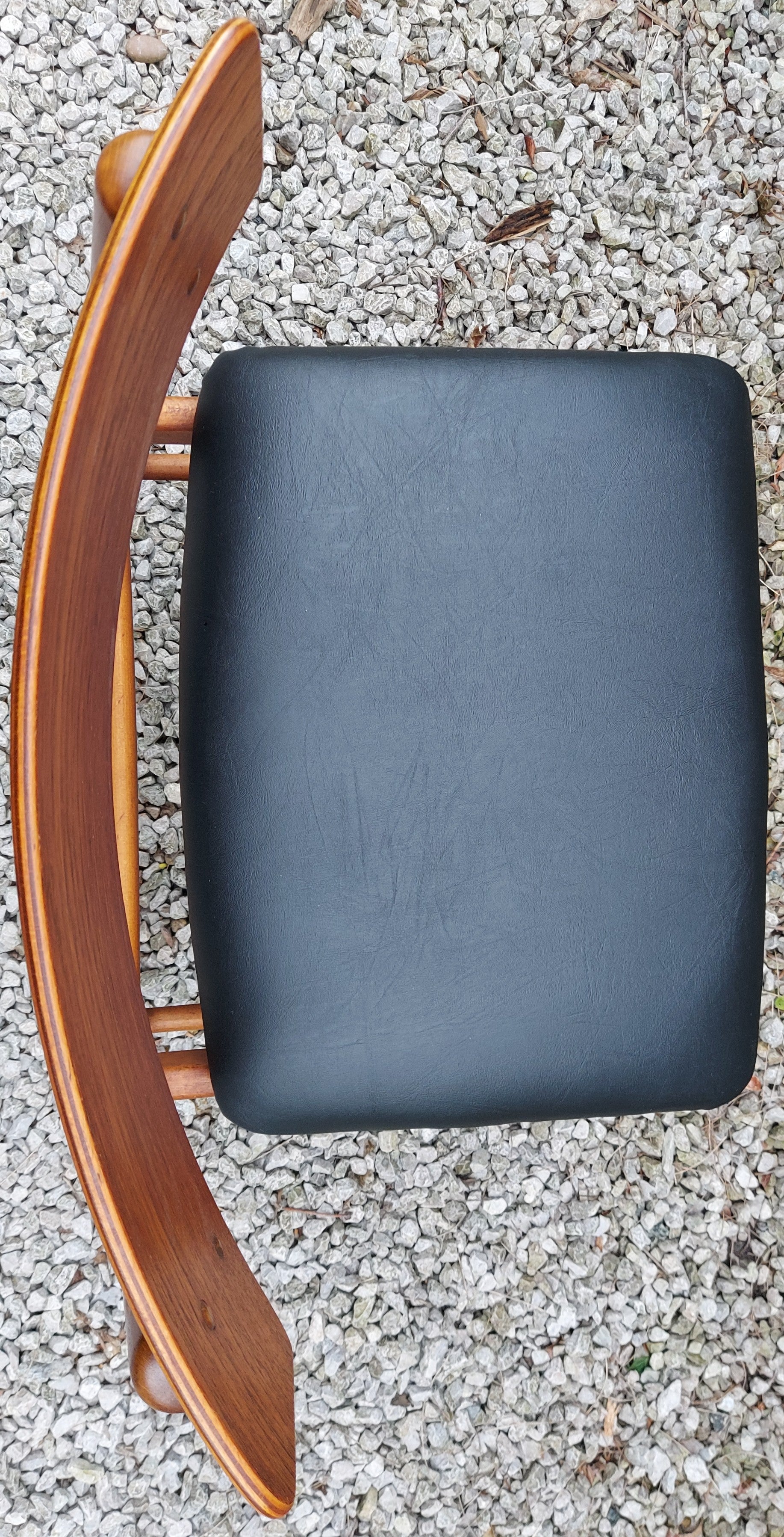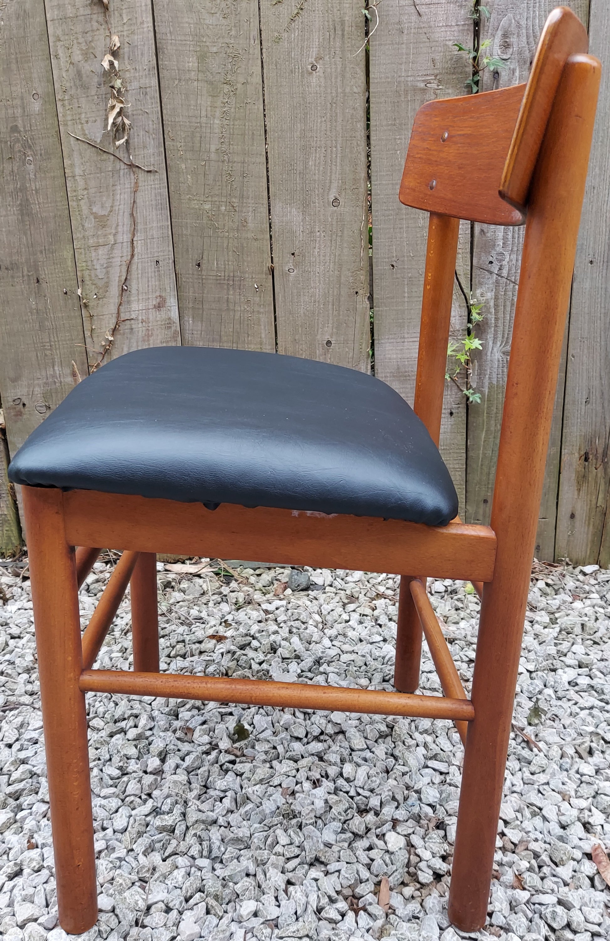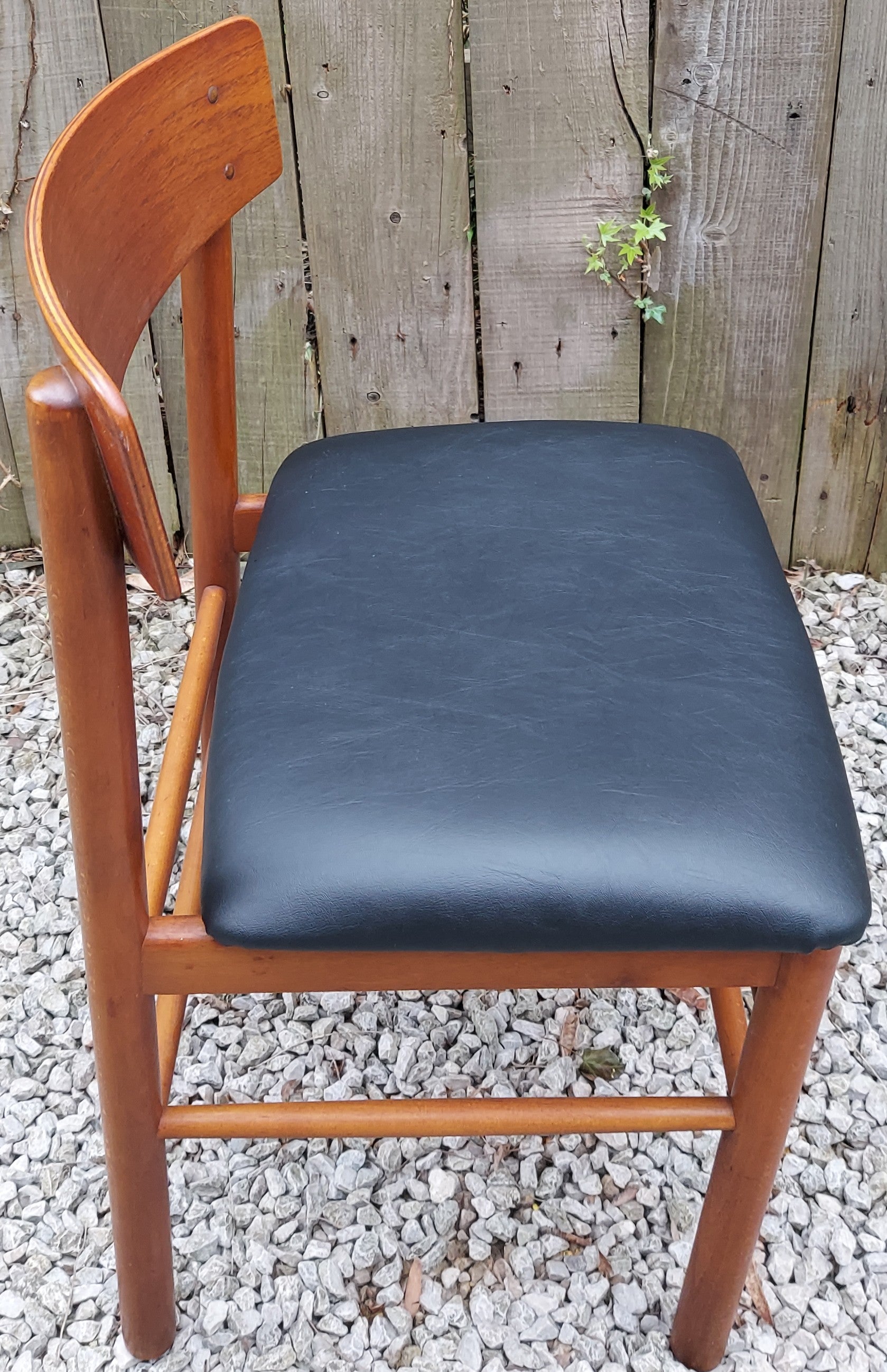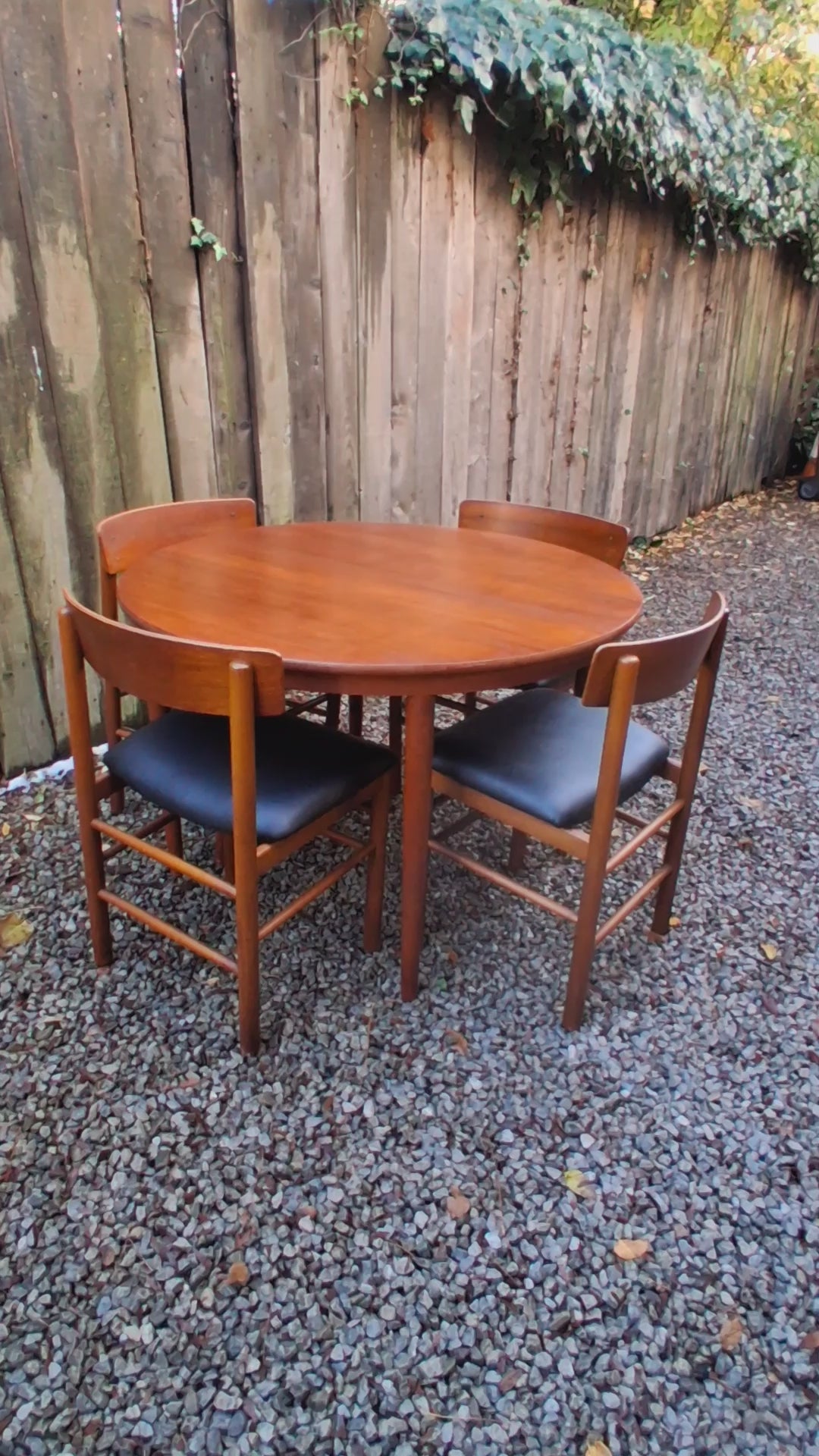 MCM Farstrup Round Dining Table And 4 Chairs AF Missing extra table leaf. I have recovered the chairs with black vinyl and sanded down the table top and reoiled it to protect the wood. The legs of the table will be unscrewed for transport so some self assembley will be needed by the buyer. Please note although the table pulls apart to extend the extending leaf of the table is missing, but it works perfectly well as a round table.The table measures approx 110 cm diameter and is 73 5 cm tall.
