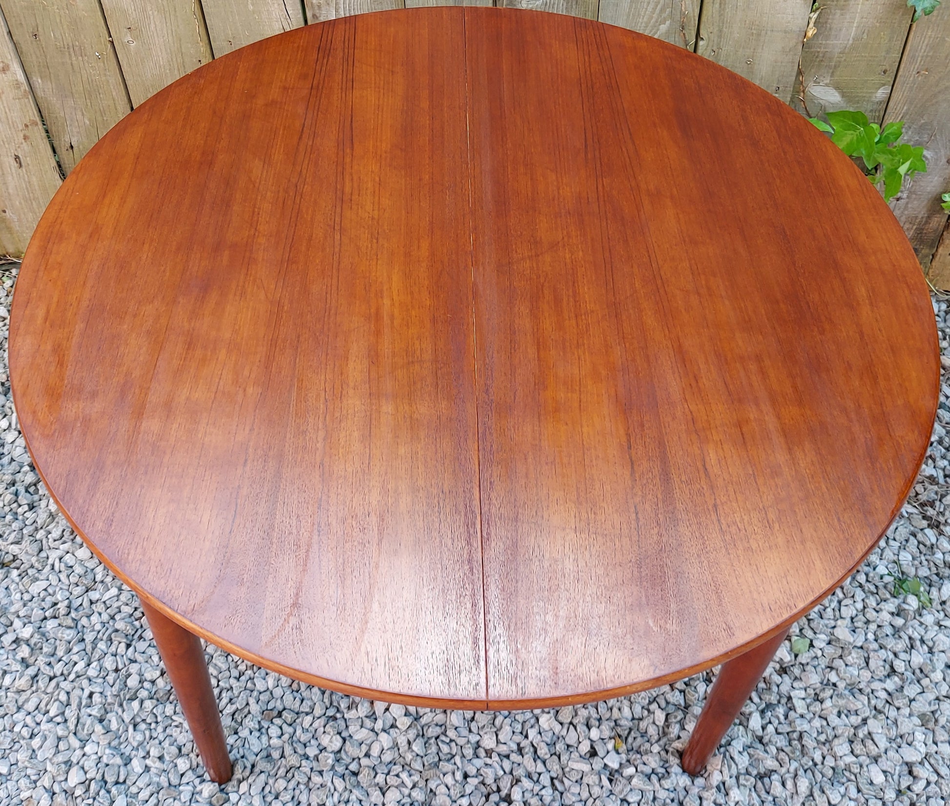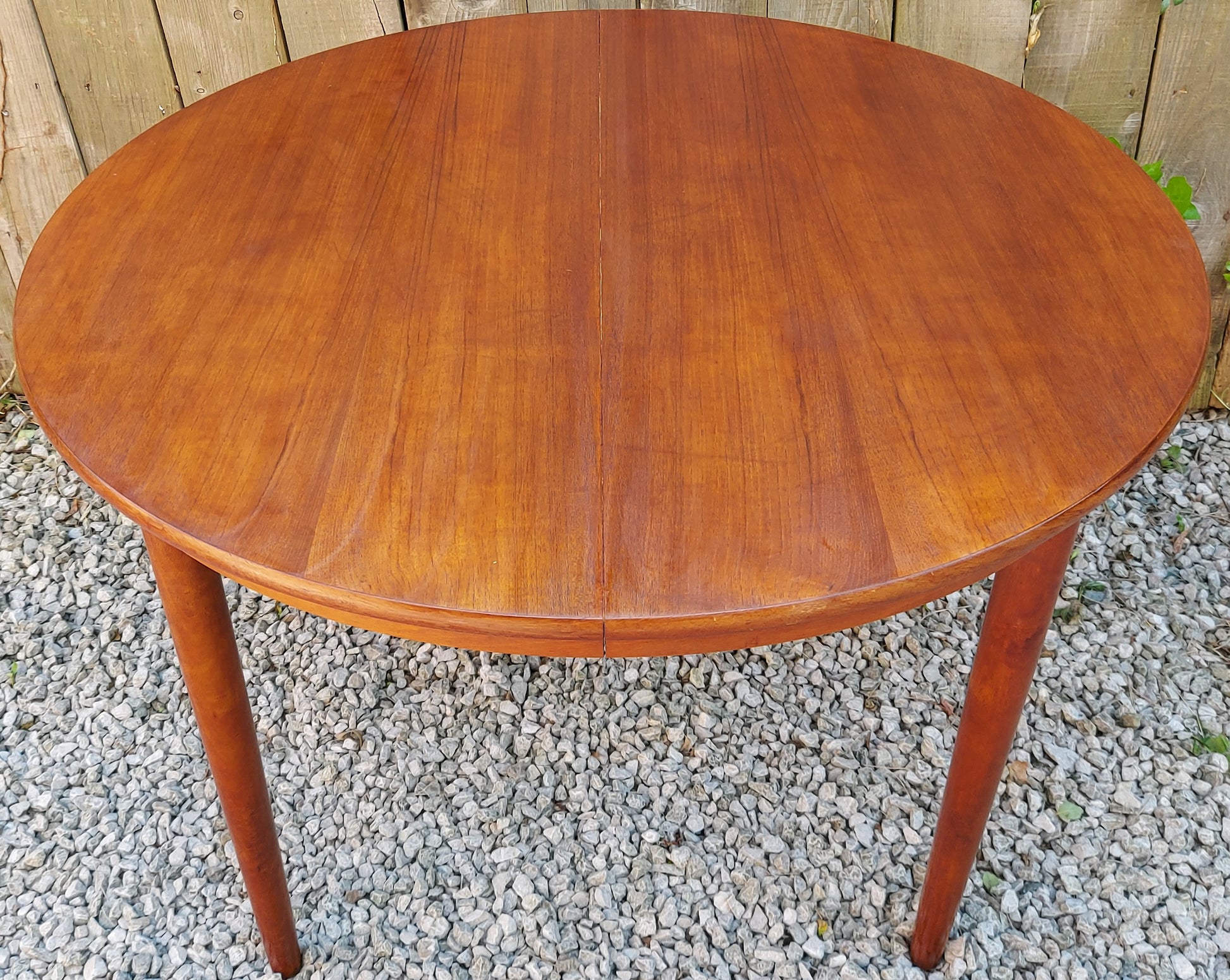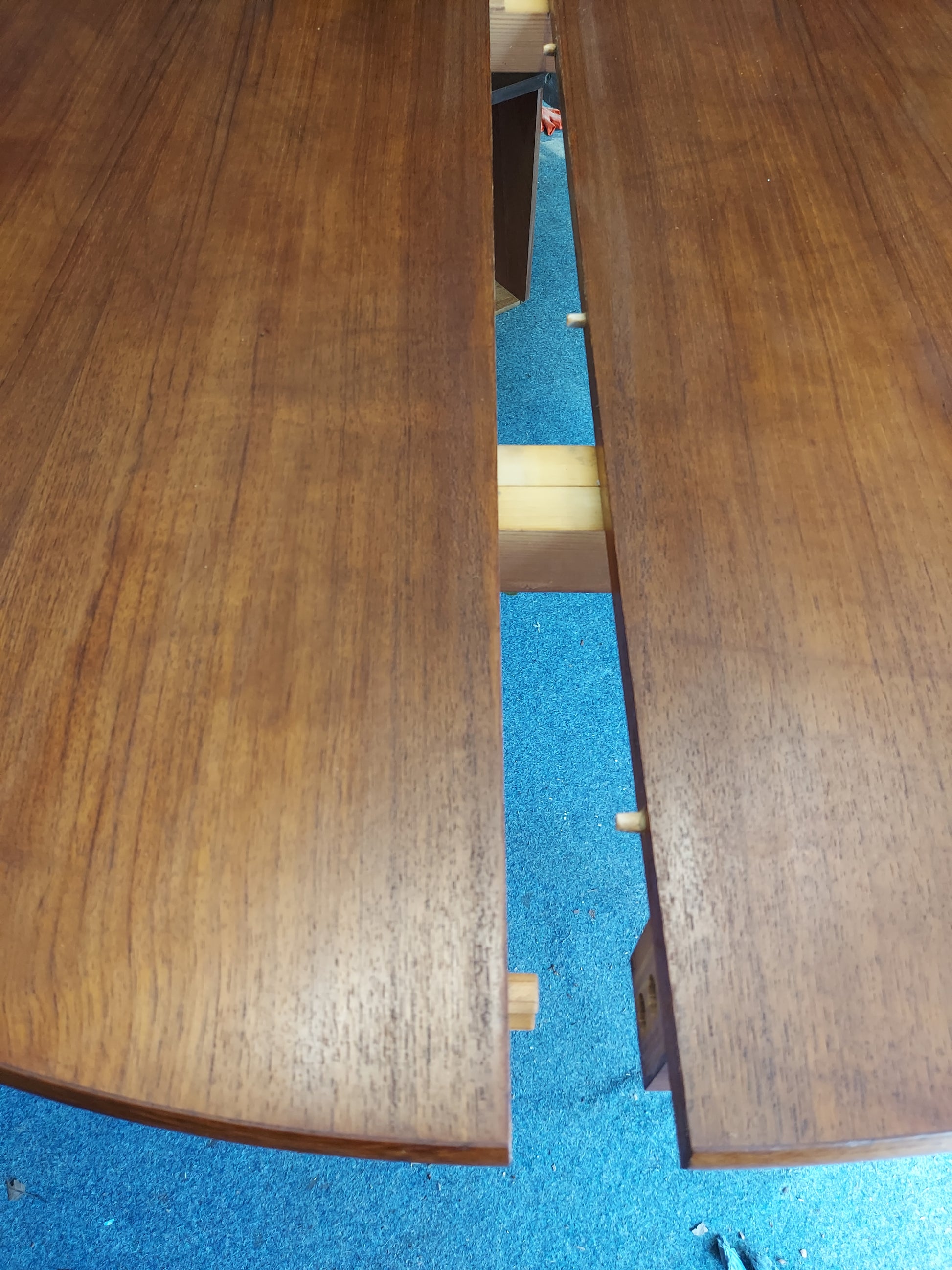 This is a preloved item so may show some signs of wear and tear consistent with its age and use. There are surface scratches to the top but I have sanded the table top down and reoiled it so it is smooth to the touch. There is some wear to the veneer at the edges. Although the table does open to accommodate an extra leaf, I do not have the extending leaf so the buyer would have to source one if . The table works perfectly as a round table. of this detracts from its use and retro loveliness.