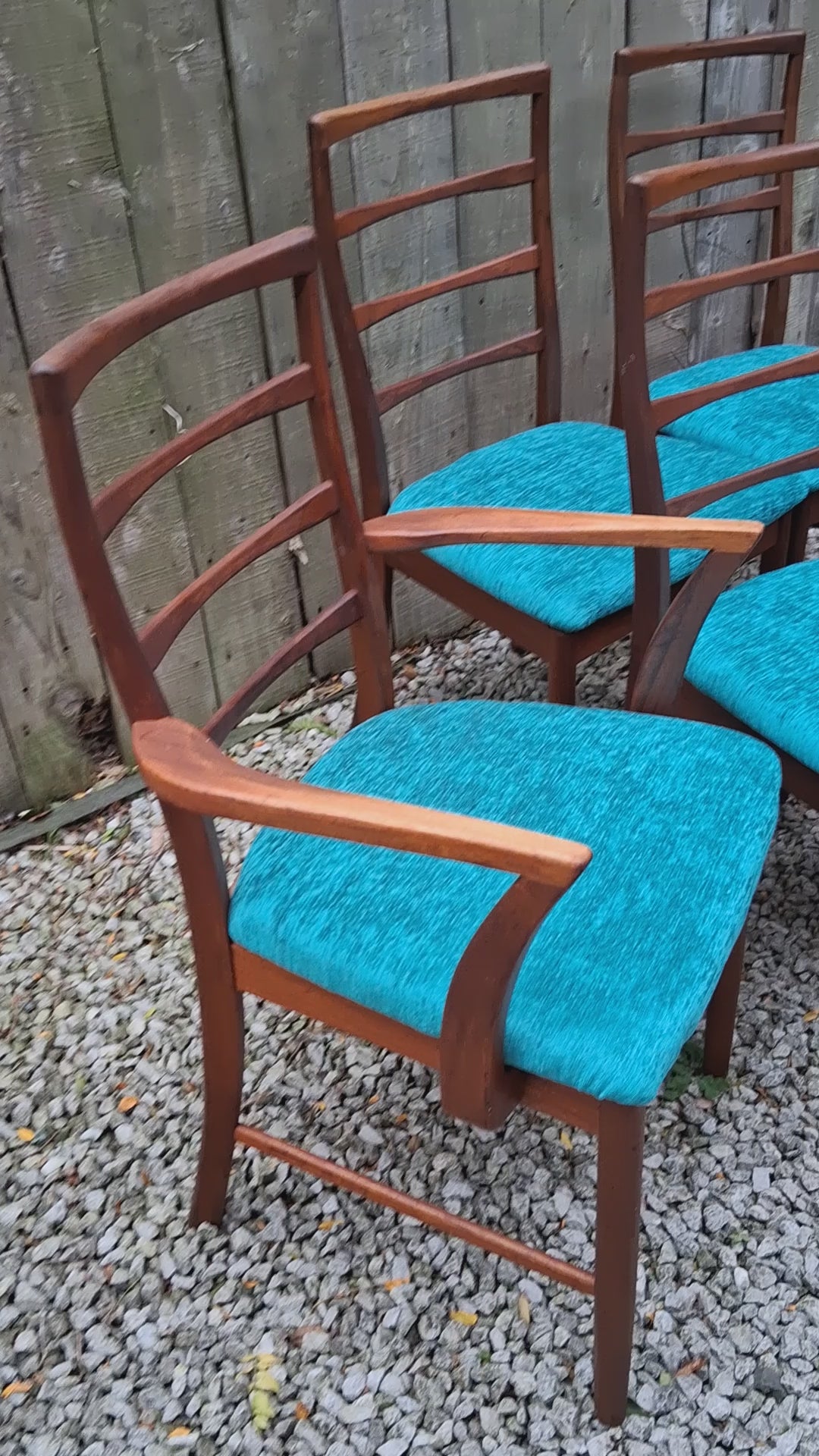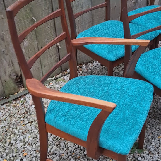 Lovely set of MCM Mcintosh of Kircaldy of 6 chairs including 2 carver chairs. The chairs have ladderbacks and have been newly refurbished with a blue/teal fabric.